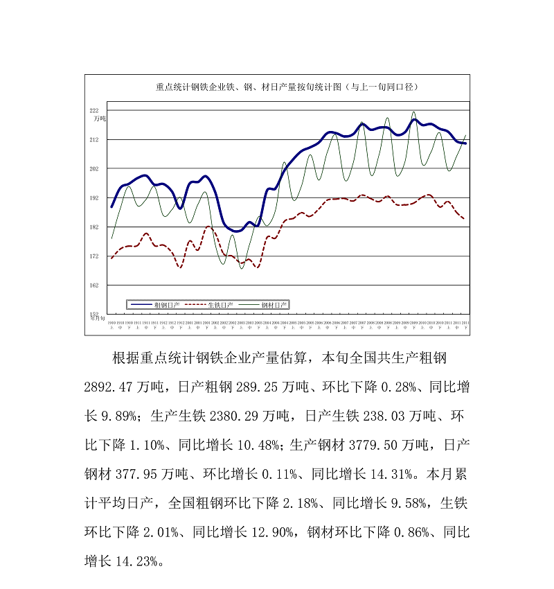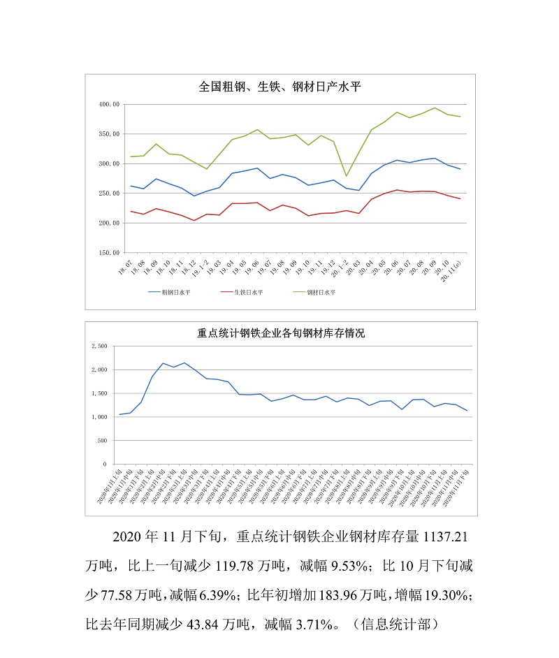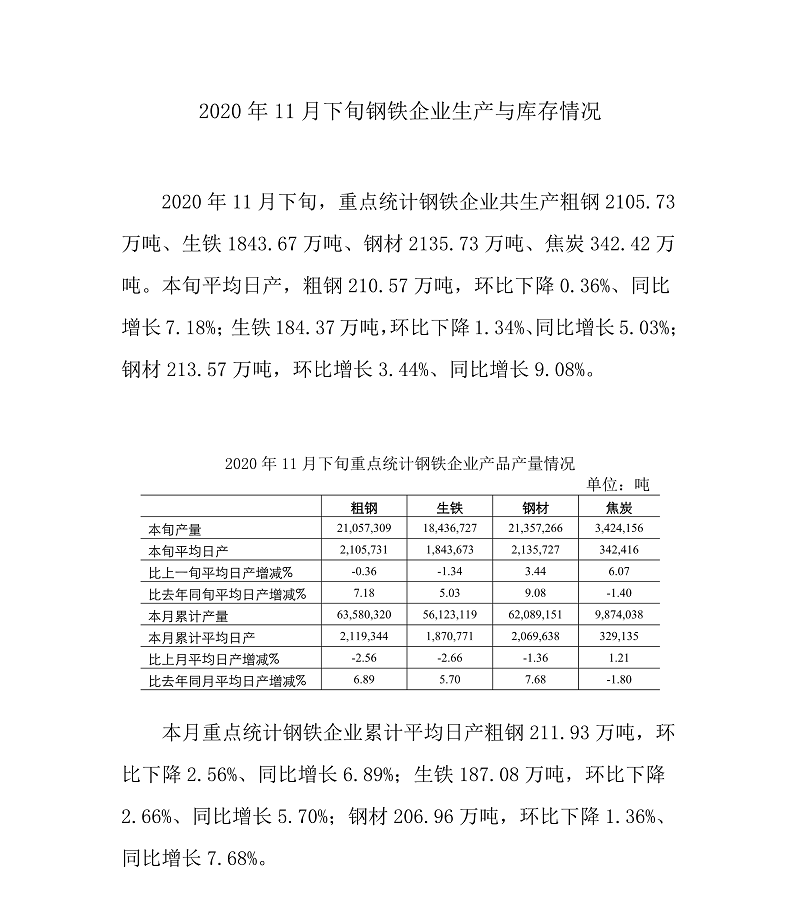 2020年11月下旬,重点统计钢铁企业共生产粗钢2105.73万吨、生铁1843.67万吨、钢材2135.73万吨、焦炭342.42万吨。