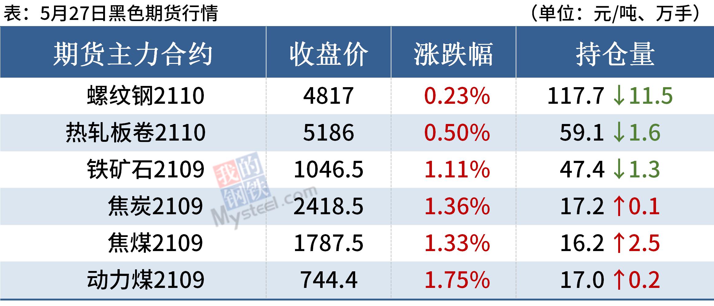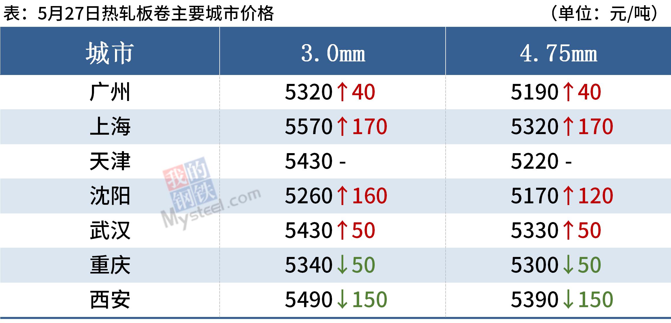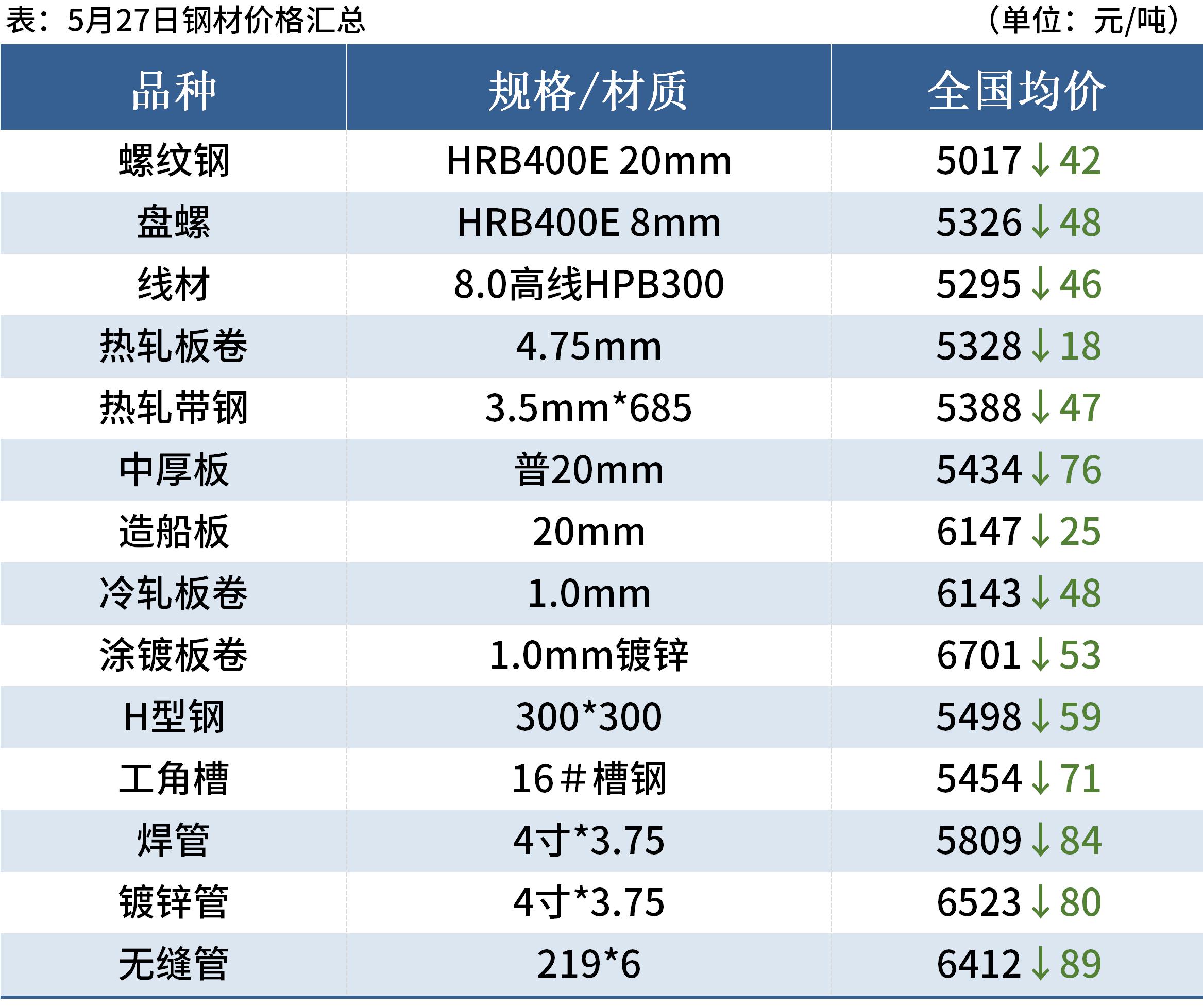 热轧板卷:5月27日,全国24个主要城市4.75mm热轧板卷均价5328元/吨,较上个交易日下跌18元/吨。经过26日的大幅下跌,市场情绪释放,多数商家愿意挺价不跌,目前现货商家手中资源基本已经打穿成本线,加上基本面尚可,商家基本不愿低价出售,挺价意愿较强,不求大幅反弹但也想稳住价格颓势,综合来看,短期盘面和现货均触底回升有企稳迹象。