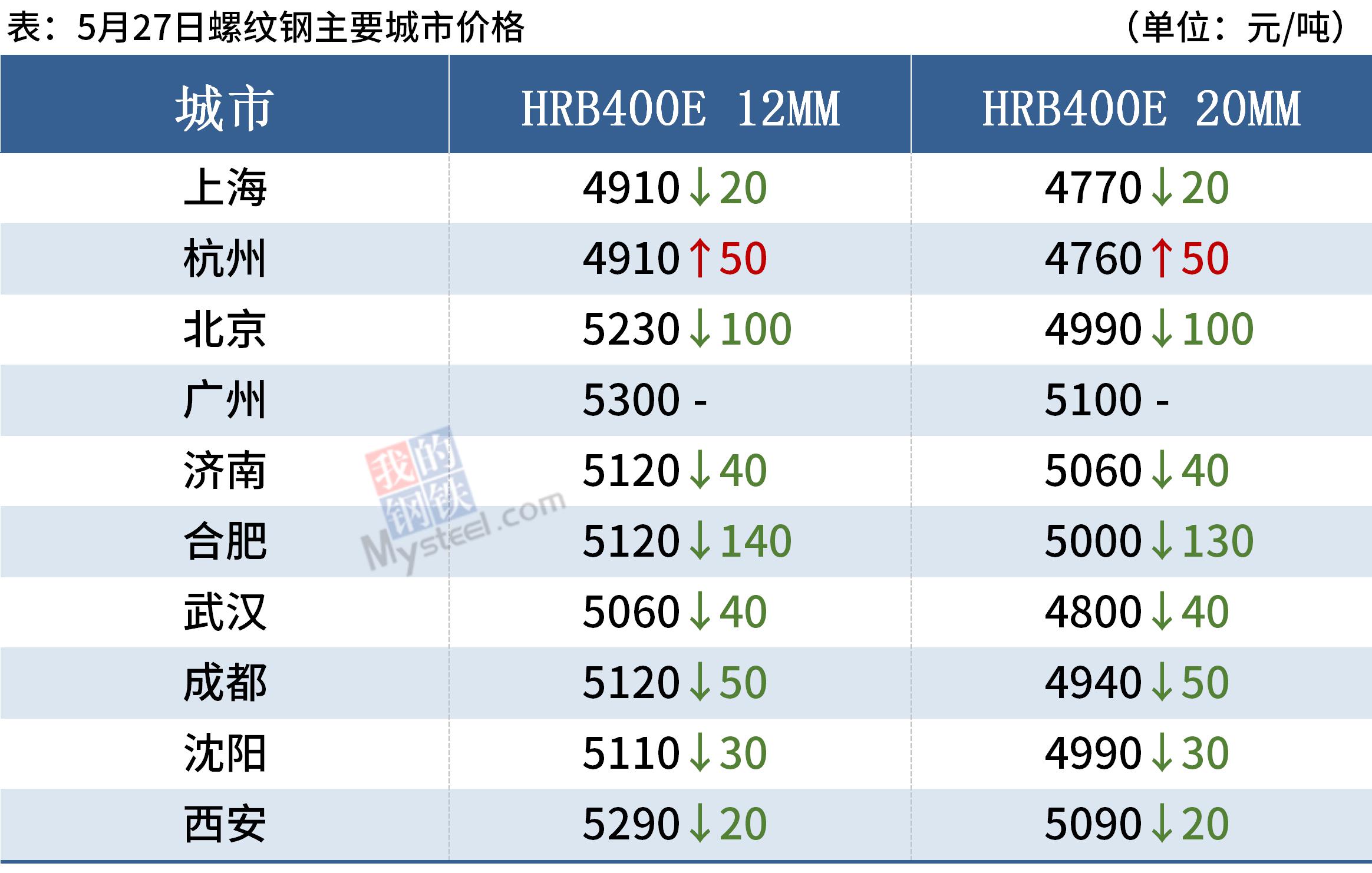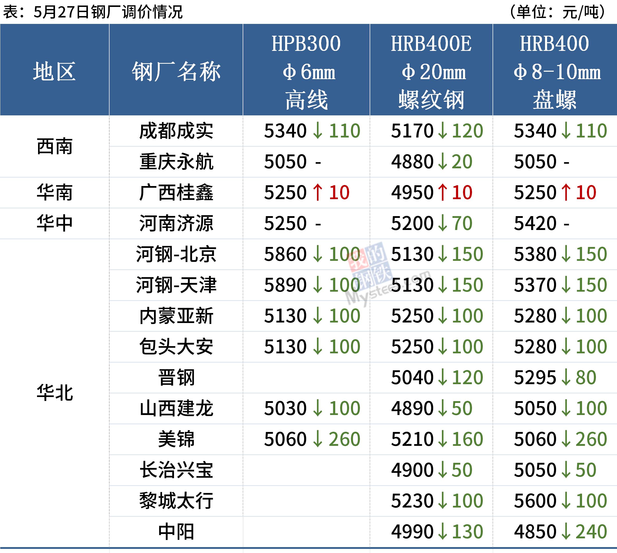27日,国内12家钢厂下调建筑钢材出厂价20-260元/吨。