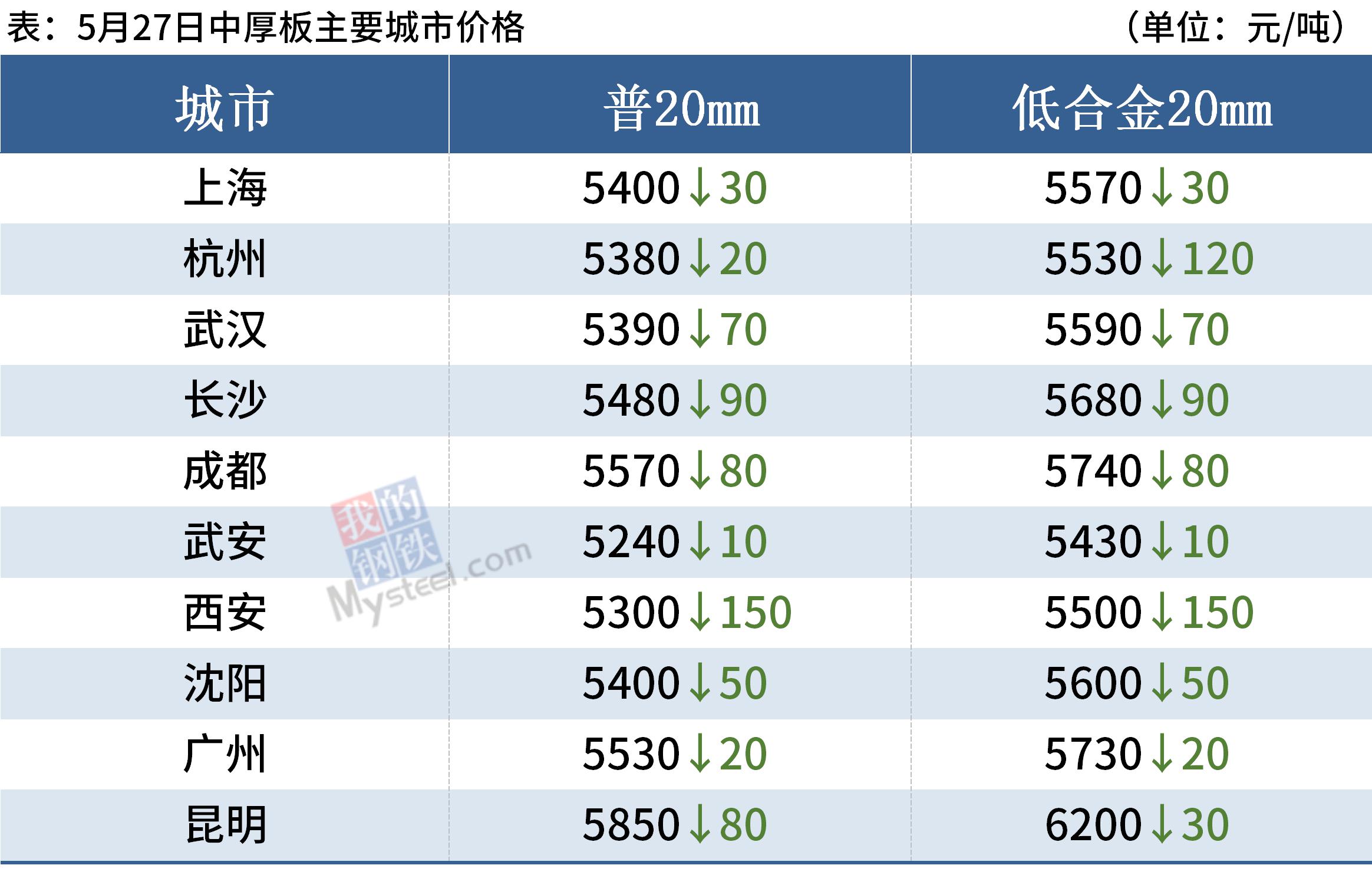 中厚板:5月27日,全国24个主要城市20mm普板均价5434元/吨,较上个交易日价格下跌76元/吨。今日价格先抑后扬,受昨日傍晚钢坯价格大幅下挫影响,今晨报价纷纷明显下调,然而期市企稳回弹,午后成交转好,市场心态好转,因而市场纷纷上涨价格。对于后市来看,市场价格进入震荡阶段,下游观望情绪将减弱,总体成交预计较前期好转。