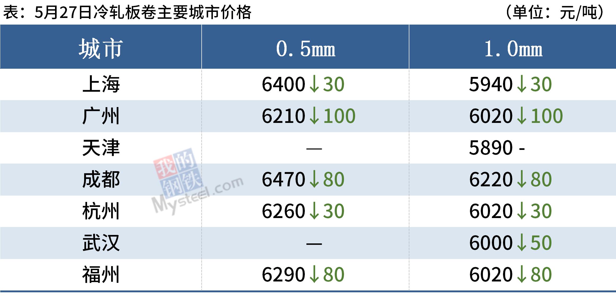 冷轧板卷:5月27日,全国24个主要城市1.0mm冷卷均价6143元/吨,较上个交易日下跌48元/吨。受今日黑色期货超低反弹,午后部分品种窄幅回暖,冷轧仍无回暖迹象。冷轧基本面基本面看,今日统计厂库社库分别增加0.64万吨和0.93万吨,且受成本高部分区域钢厂接单不理想,预计后期厂库增量或有所放大。
