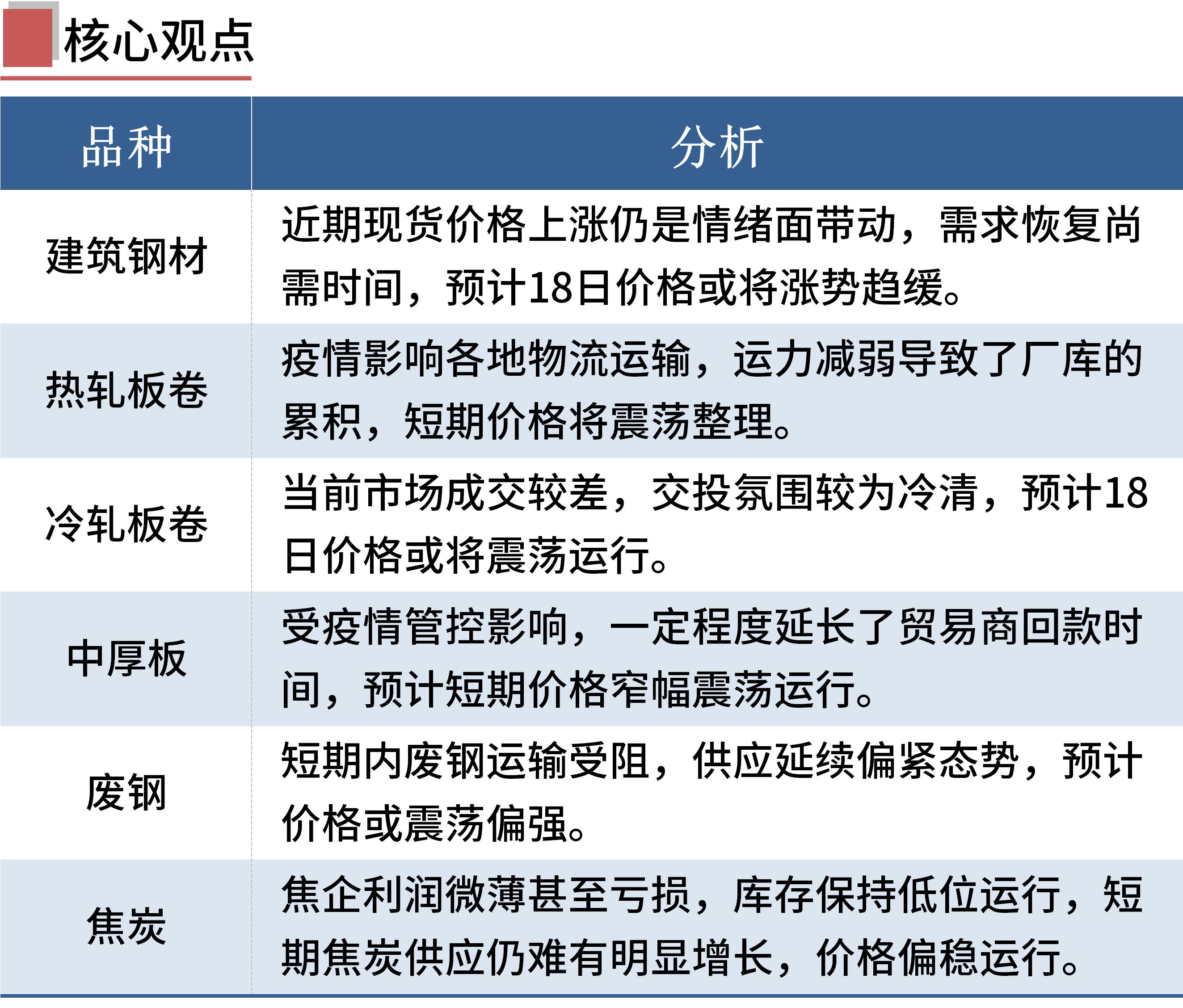 展望后期,本轮疫情尚未结束,下游终端实际需求依然疲弱,钢市供需基本面偏弱格局难改,仅靠市场信心难以持续推动钢价反弹。重点关注国内疫情形势,可能出台的稳增长政策以及国际局势变化。