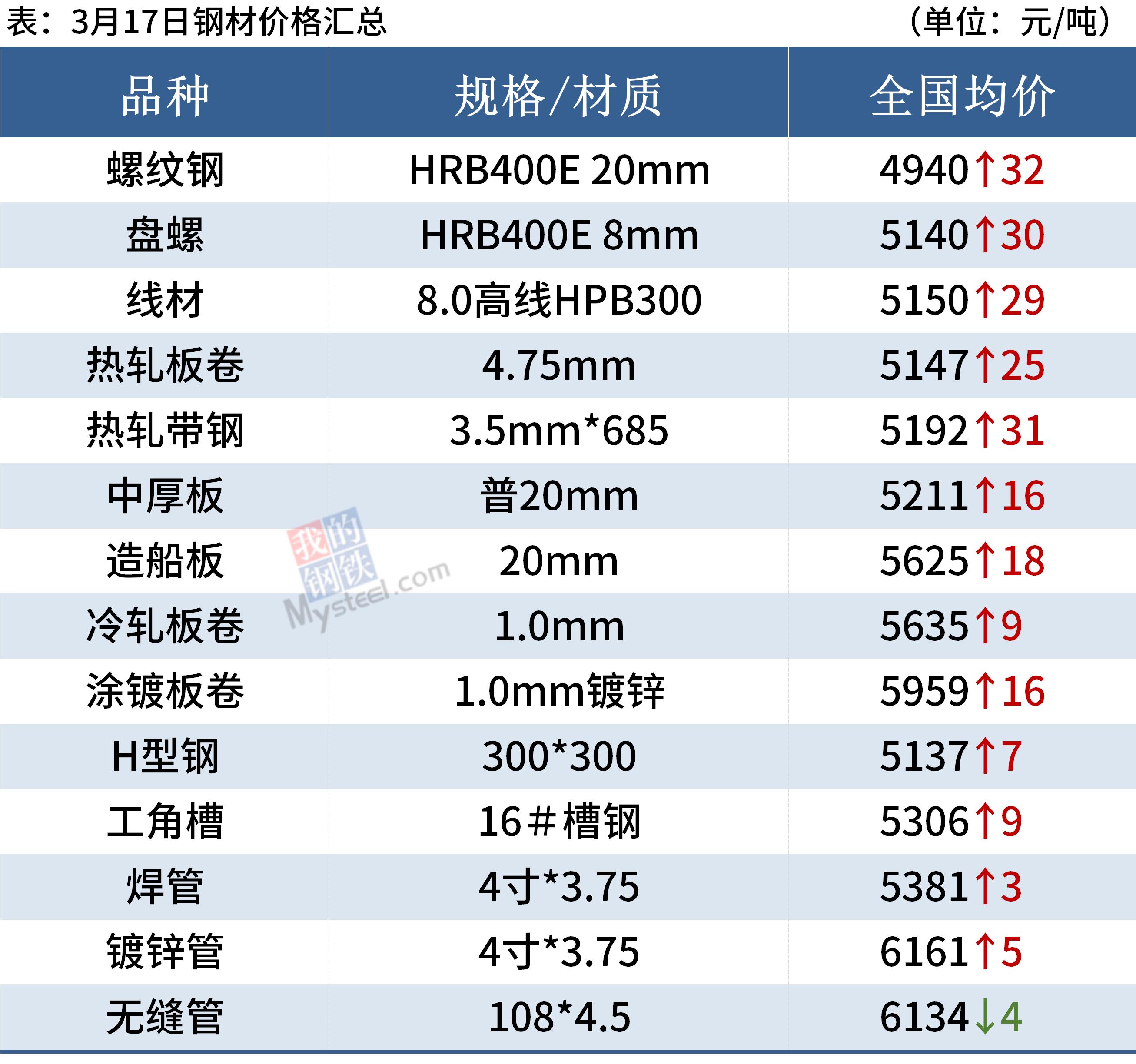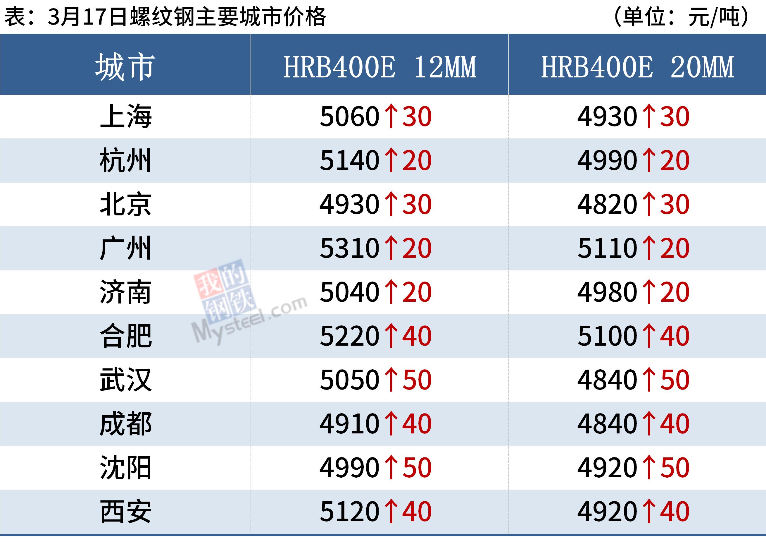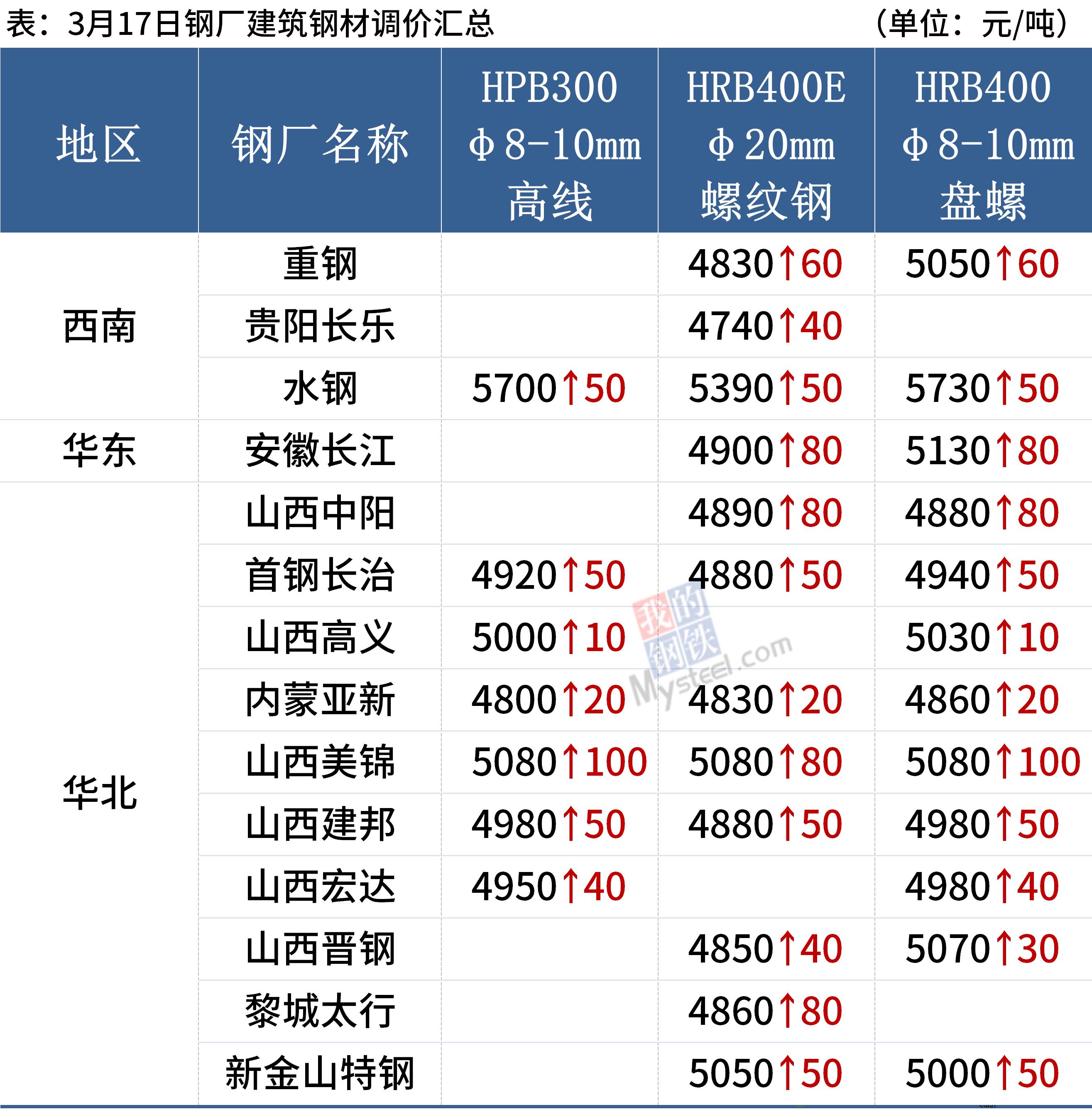 17日,国内14家钢厂上调建筑钢材出厂价10-100元/吨。