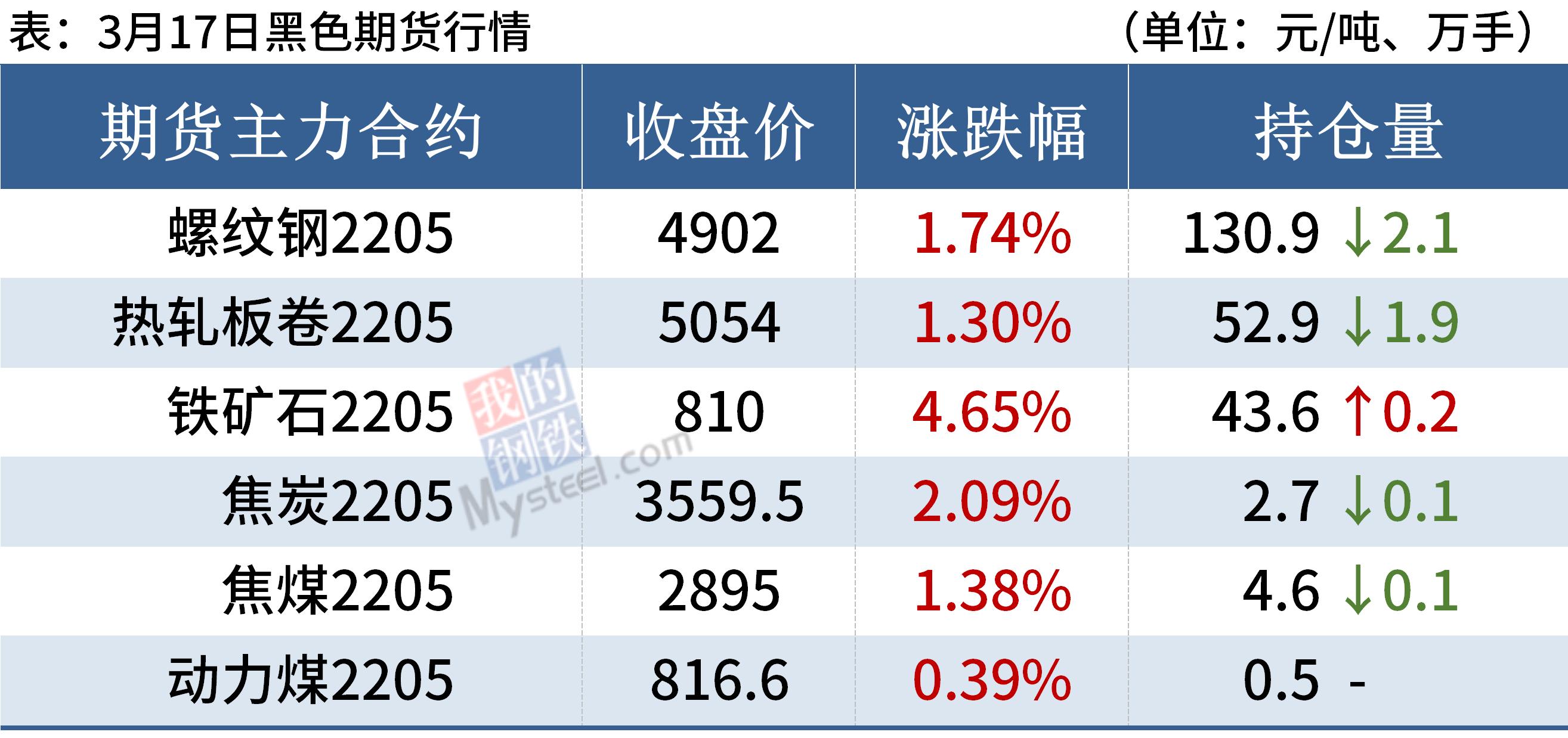 焦炭:3月17日,焦炭市场偏稳运行。各地疫情复发影响甚广,车辆进出严格管控,部分多转火运出货,汽运暂时受限,两会后焦企方面开工有所恢复,计划提产,但利润微薄甚至亏损,库存保持低位运行,短期焦炭供应仍难有明显增长。下游钢厂高炉复产,受疫情影响物流受阻,钢厂库存低位,仍然积极补库中。原料端产地部分煤矿煤价仍有小幅上涨现象,但竞拍市场出现流拍现象,整体成交情况近期已明显走弱,预计短期内焦炭市场偏稳运行,后期需继续关注疫情影响、原料成本、成材利润对焦炭价格的影响。