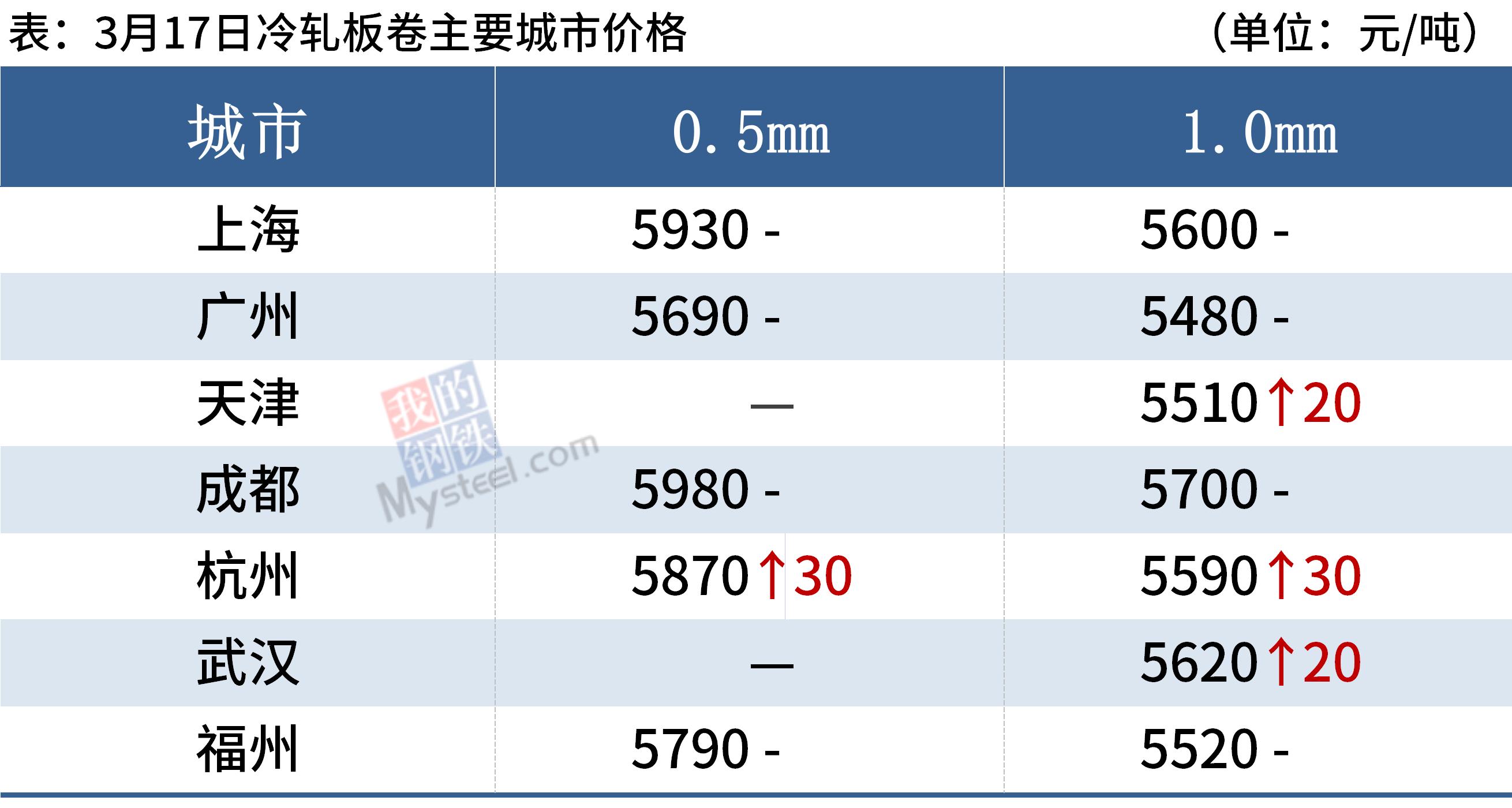 冷轧板卷:3月17日,全国24个主要城市1.0mm冷卷均价5635元/吨,较上个交易日上涨9元/吨。受疫情影响部分中高风险地区车辆货物实行临时管控,导致资源不能送到终端客户,局部区域出现降库放缓,甚至出现库存回升的风险;当前市场成交较差,交投氛围较为冷清,下游客户以按需采购为主,需求持续疲软。库存方面,据Mysteel不完全统计,现冷轧钢厂库存33.94万吨,周环比减少0.63万吨,社会库存143.12万吨,周环比减少0.28万吨,周消费量83.12万吨,环比增加2.90万吨。综合来看,故预计18日国内冷轧板卷价格或将震荡运行。