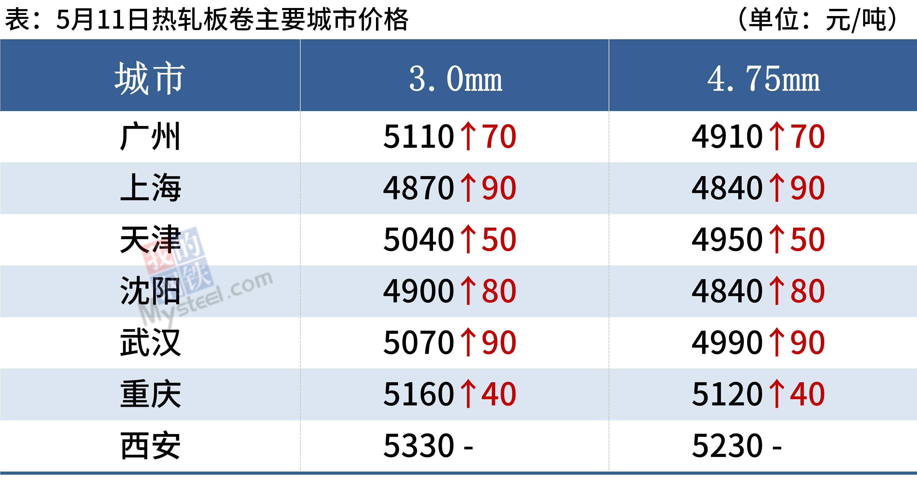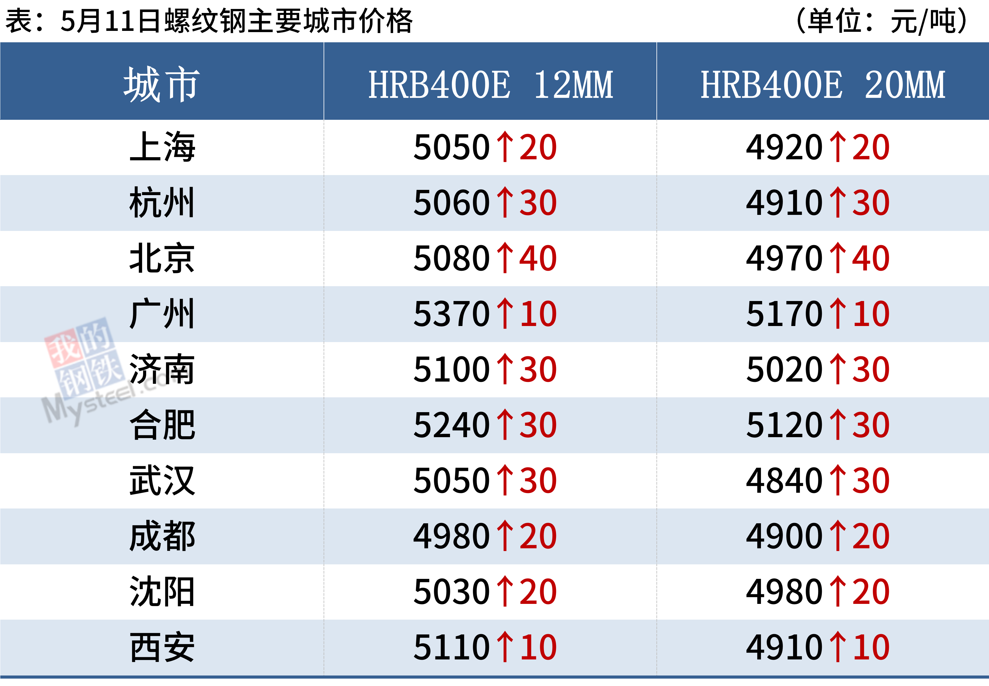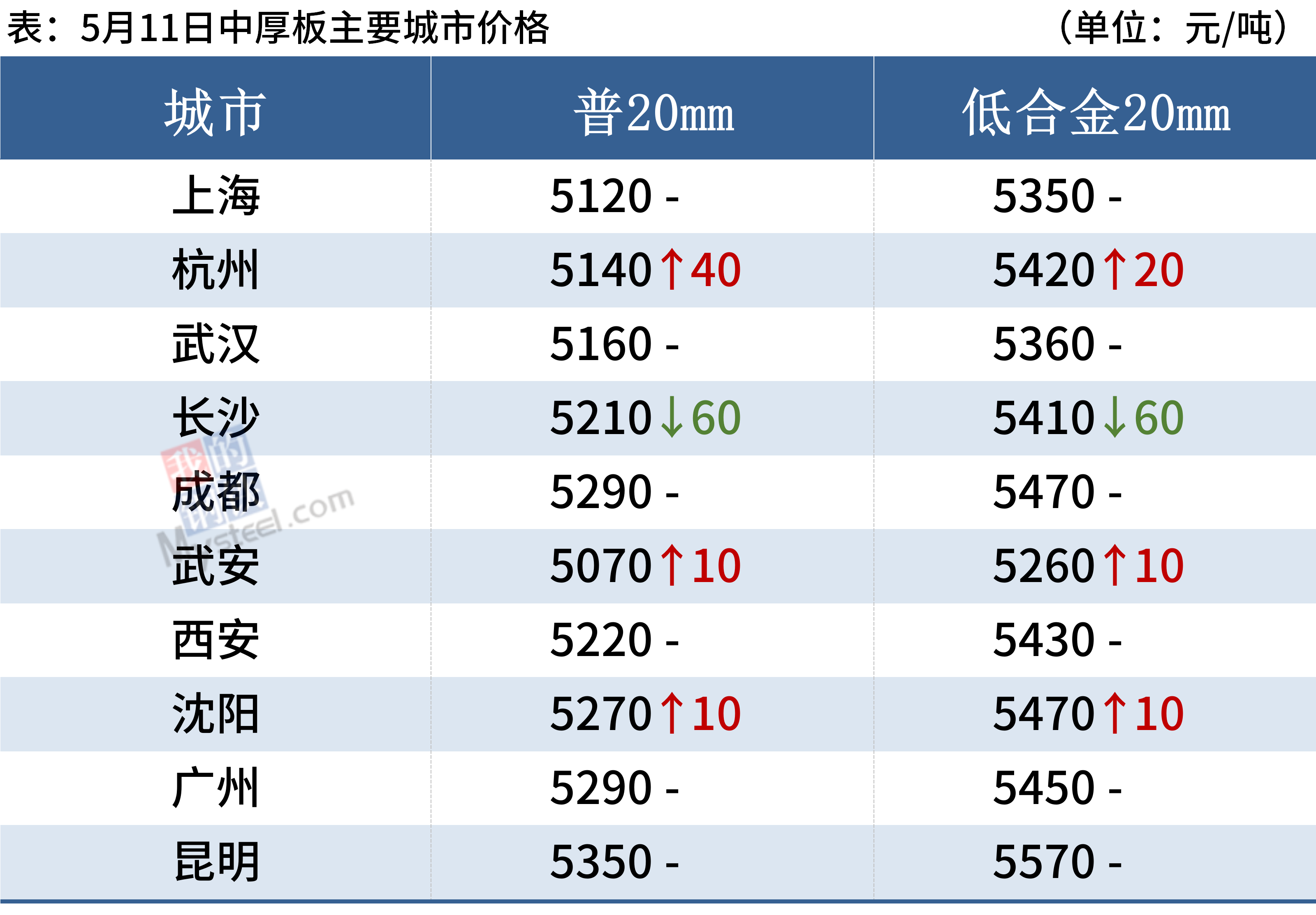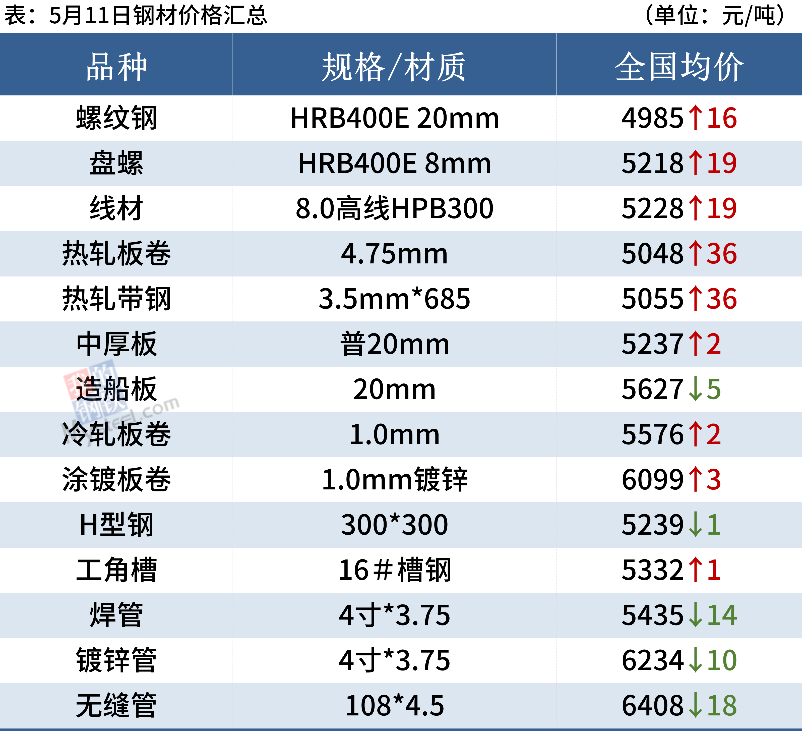 5月11日,国内钢材市场上涨为主,唐山钢坯出厂价格涨20报4640元/吨。成交方面,市场心态修复,投机需求有所增加,低价资源消失。