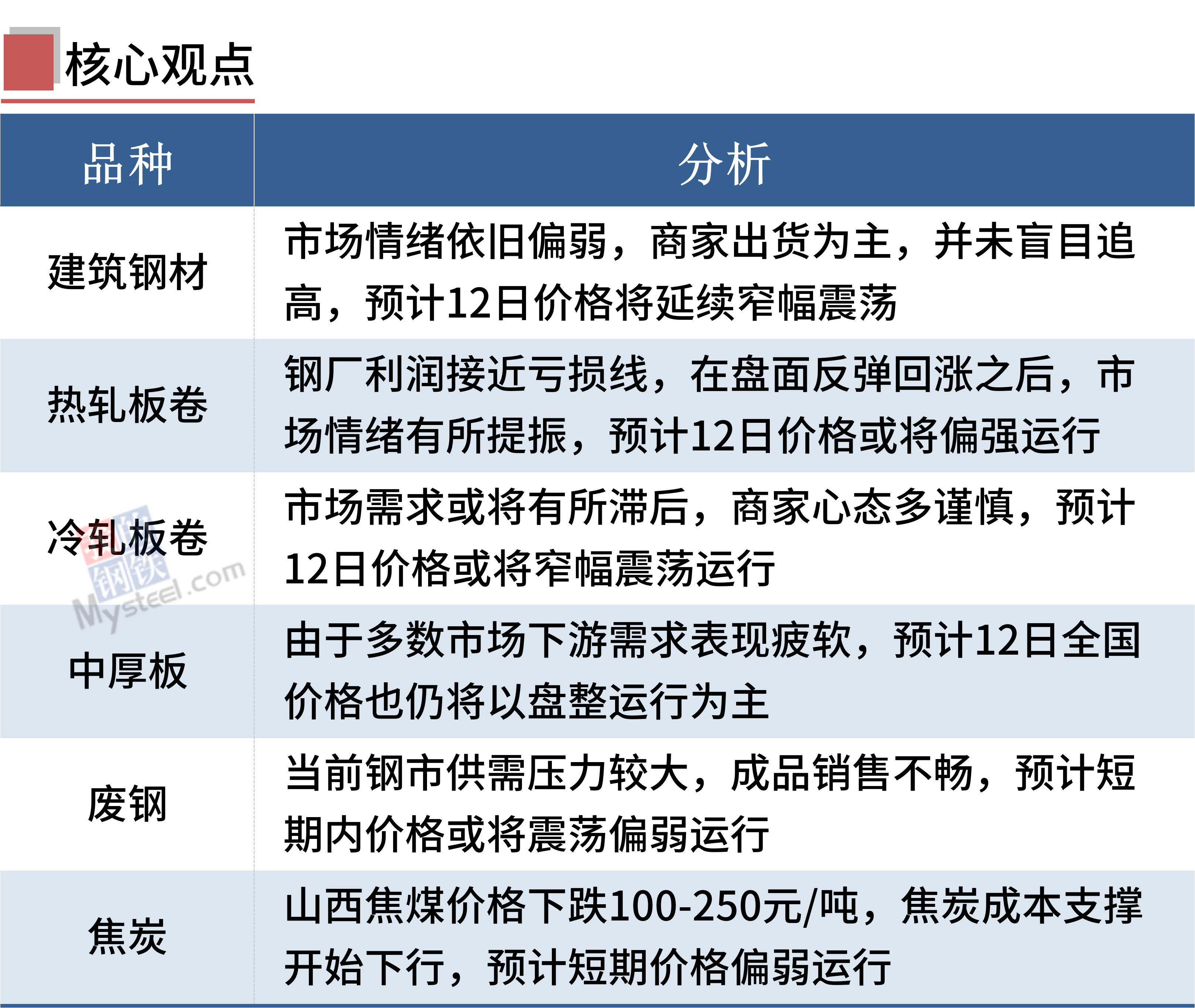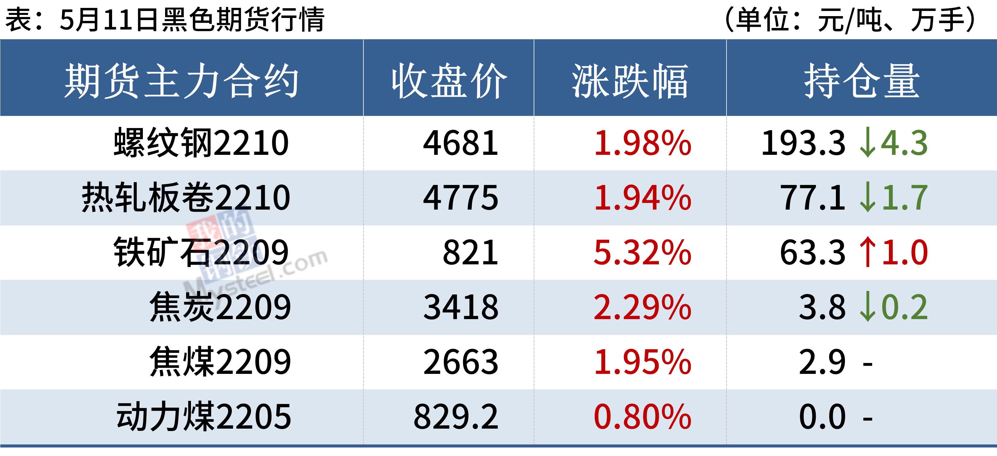 焦炭:5月11日,焦炭市场偏弱运行,焦炭市场全面落实第二轮降价,累计降幅为400元/吨。焦企前期焦化利润修复,产地开工多提升至高位,焦炭供应相对有保证,即产即销,多以积极出货为主。钢厂方面,钢厂开工仍在高位,刚需仍在,钢厂多有意控制到货节奏。焦煤方面,前期降价后出货仍不佳,部分煤矿库存累积,今日山西焦煤价格下跌100-250元/吨,焦炭成本支撑开始下行,预计短期内焦炭市场偏弱运行。