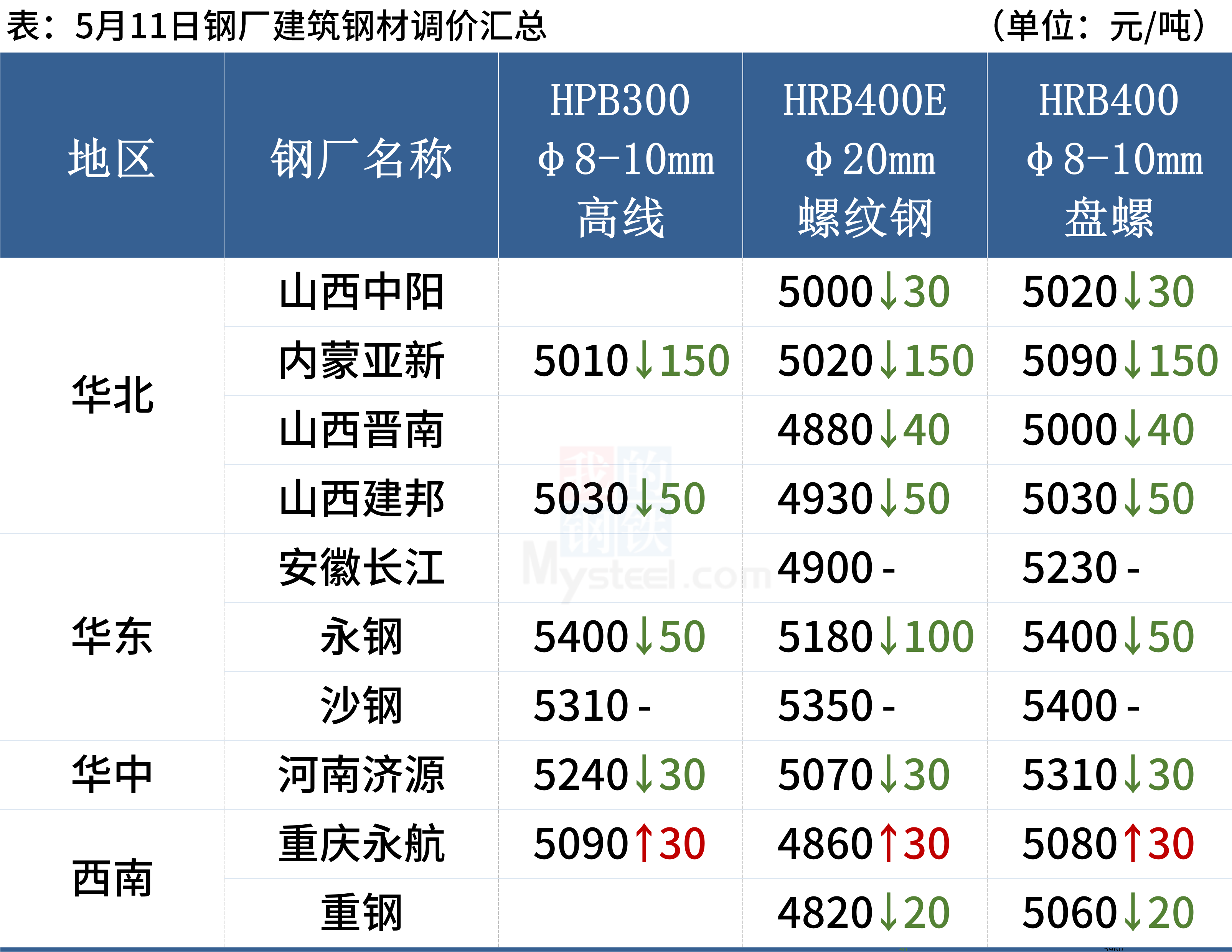 11日,7家钢厂下调建筑钢材出厂价20-150元/吨。