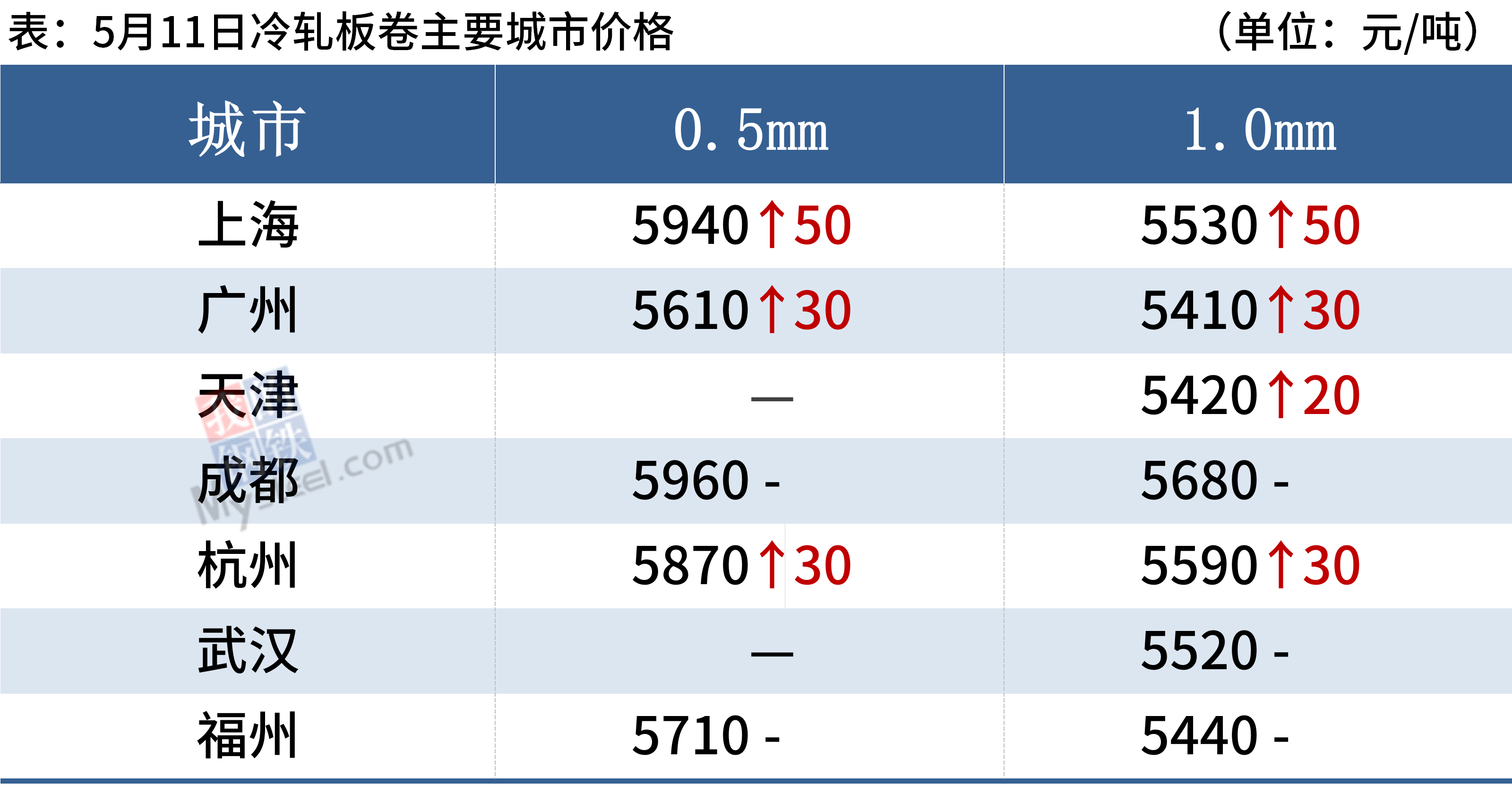 冷轧板卷:5月11日,全国24个主要城市1.0mm冷卷均价5576元/吨,较上个交易日持上涨2元/吨。市场方面,随着热卷期货止跌反弹,市场交投氛围有所好转,市场成交明显增量。商家表示,前期市场价格持续下行,下游多持观望态度,随着价格逐步企稳,前期被抑制的需求有所放量。心态方面,全国疫情散点式爆发,加之南方近期进入汛期,市场需求或将有所滞后,商家心态多谨慎,当下操作以出货成交为主。综上所述,预计12日全国冷轧板卷价格或将窄幅震荡运行。