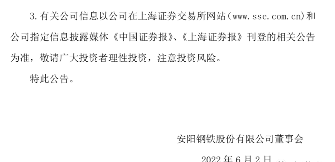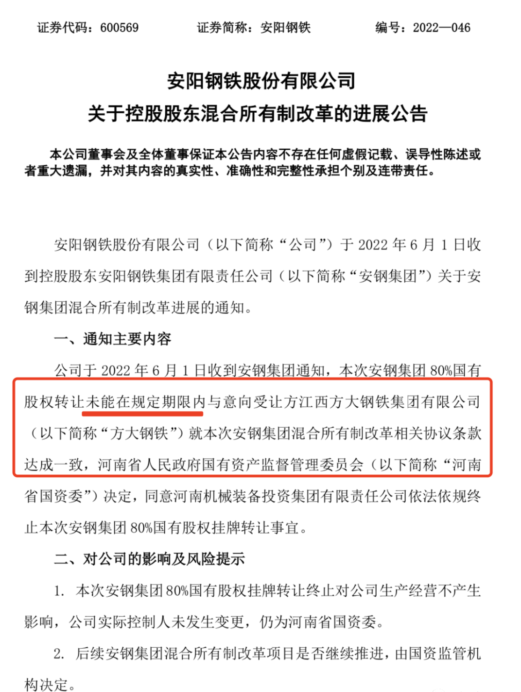 6月1日,安阳钢铁公告称,其控股股东安钢集团80%国有股权转让未能在规定期限内与意向受让方——江西方大钢铁集团就相关协议条款达成一致。河南省国资委决定,同意河南机械装备投资集团依法依规终止本次安钢集团80%国有股权挂牌转让事宜。