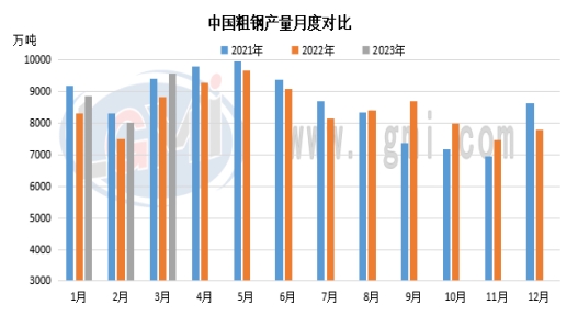 1-3月份,中国粗钢产量26156万吨,同比增长6.1%,创下历年产量新高。受经济企稳以及开工旺季预期等提振,钢厂粗钢产量明显提升。整体来看,今年一季度仅在3月上旬华北部分区域受环保因素影响存在短暂限产情况,支撑粗钢产量高位运行。另外,2023年粗钢产量调控政策定调为平控,即在2022年10.18亿吨基础上不增不减。2023年粗钢产量调控政策基于两方面考虑:一方面,疫情管控已经放开,全球重新互联互通,国内钢材需求整体看好,如在2022年较低基数上继续压产,或致供需紧张。另一方面,需求增量预计仍然有限。