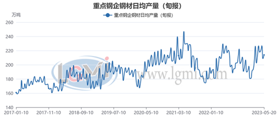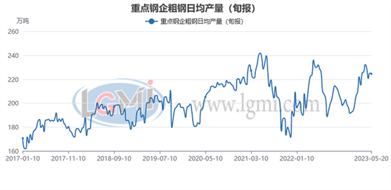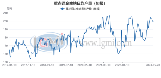 据中国钢铁工业协会统计数据显示,2023年5月中旬重点钢企生铁日均产量199.53万吨,旬环比下降0.52%,同比下降1.75%;5月中旬重点钢企粗钢日均产量224.55万吨,旬环比下降0.24%,同比下降2.33%;5月中旬重点钢企钢材日均产量213.97万吨,旬环比上升2.53%,同比下降3.59%。