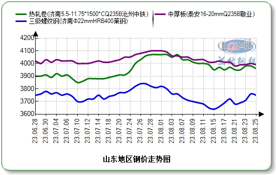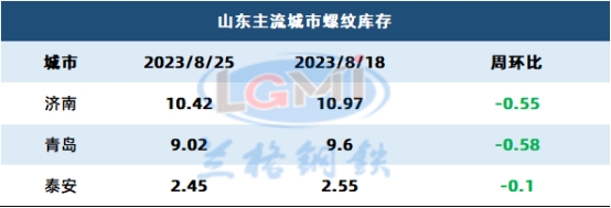 本周山东区域库存情况表现不一,建材库存小幅下降,板材区域窄幅增加。具体来看截止到8月26日,建材方面,济南螺纹库存总量10.42万吨,较上周下降0.55万吨;青岛螺纹库存9.02万吨,较上周下降0.58万吨;泰安螺纹库存2.45万吨,较上周微降0.1万吨。