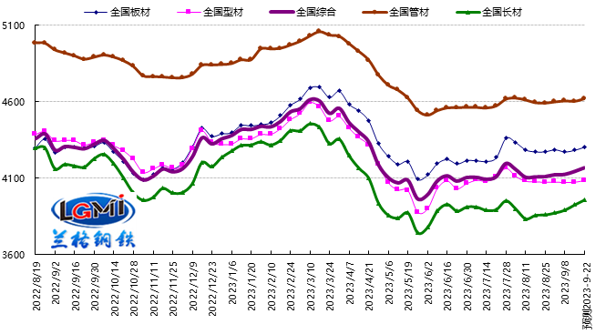 2023年第37周(2023.9.11-9.15)兰格钢铁全国绝对价格指数为4145元,较上周上升0.7%,较去年同期下降3.9%。其中,兰格钢铁长材绝对价格指数为3926元,较上周上升1.3%,较去年同期下降6.3%;兰格钢铁型材绝对价格指数为4074元,与上周持平,较去年同期下降6.4%;兰格钢铁板材绝对价格指数为4285元,较上周上升0.5%,较去年同期下降0.7%;兰格钢铁管材绝对价格指数为4604元,较上周下降0.1%,较去年同期下降6.4%。