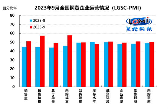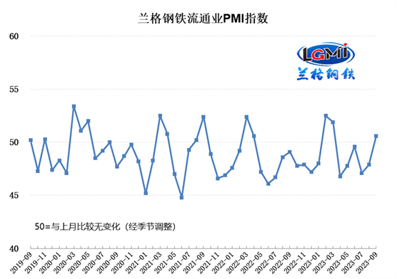 兰格钢铁网统计发布的2023年9月份钢铁流通业PMI总指数为50.6%,较上月上升2.7个百分点,再次回到了扩张区间。从分类指数看,构成钢铁流通业PMI的10个分类指数9升1降,其中销售量、销售价格、总订单量、采购成本、到货速度、融资环境、企业雇员、走势判断和采购意愿9项指数上升,库存水平1项指数下降。