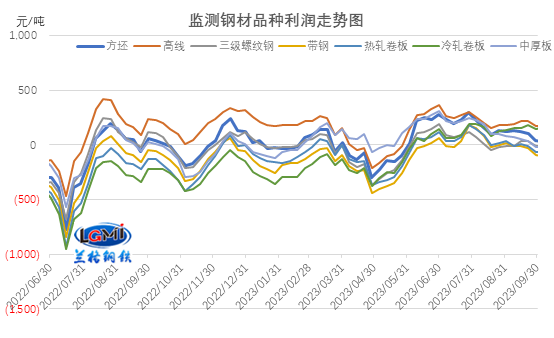 以四周原料库存测算各品种的毛利表现来看,随着钢价震荡走弱,以及成本方面韧性,9月份钢企吨钢毛利呈现先升后降的趋势,从均值来看,毛利趋势有所走弱。兰格钢铁研究中心监测数据显示,从月度整体来看,监测的七大品种月均毛利中,除带钢、热轧卷板亏损外,其他品种仍保持盈利状态,盈利幅度在8-194元/吨之间,但与8月份相比,除三级螺纹钢、冷轧卷板盈利略有改善外,其他各品种盈利均有所收缩,其中,中厚板毛利收缩最大,收缩幅度在106元/吨;而高线毛利收缩最小,为3元/吨;其他品种如方坯、带钢、热轧卷板毛利收缩幅度在49-72元/吨之间。