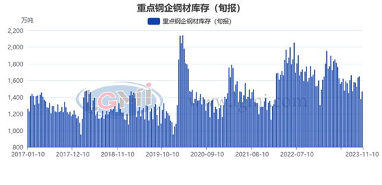 据中国钢铁工业协会统计数据显示,2023年11月上旬重点钢铁企业钢材库存量为1468.96万吨,旬环比增加91.83万吨,上升6.67%;比上月同旬减少167.15万吨,下降10.22%;比去年底增加161.52万吨,上升12.35%;比去年同旬减少203.22万吨,下降12.15%。