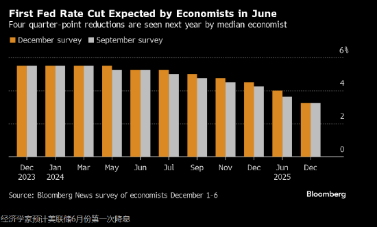 调查显示,在本周发布经济预测摘要时,对通胀持谨慎态度的央行在预测降息方面将比市场保守得多。据12月1-6日对49位经济学家的调查,预计鲍威尔等人在会后发布的点阵图中预计明年降息幅度仅为0.5个百分点。