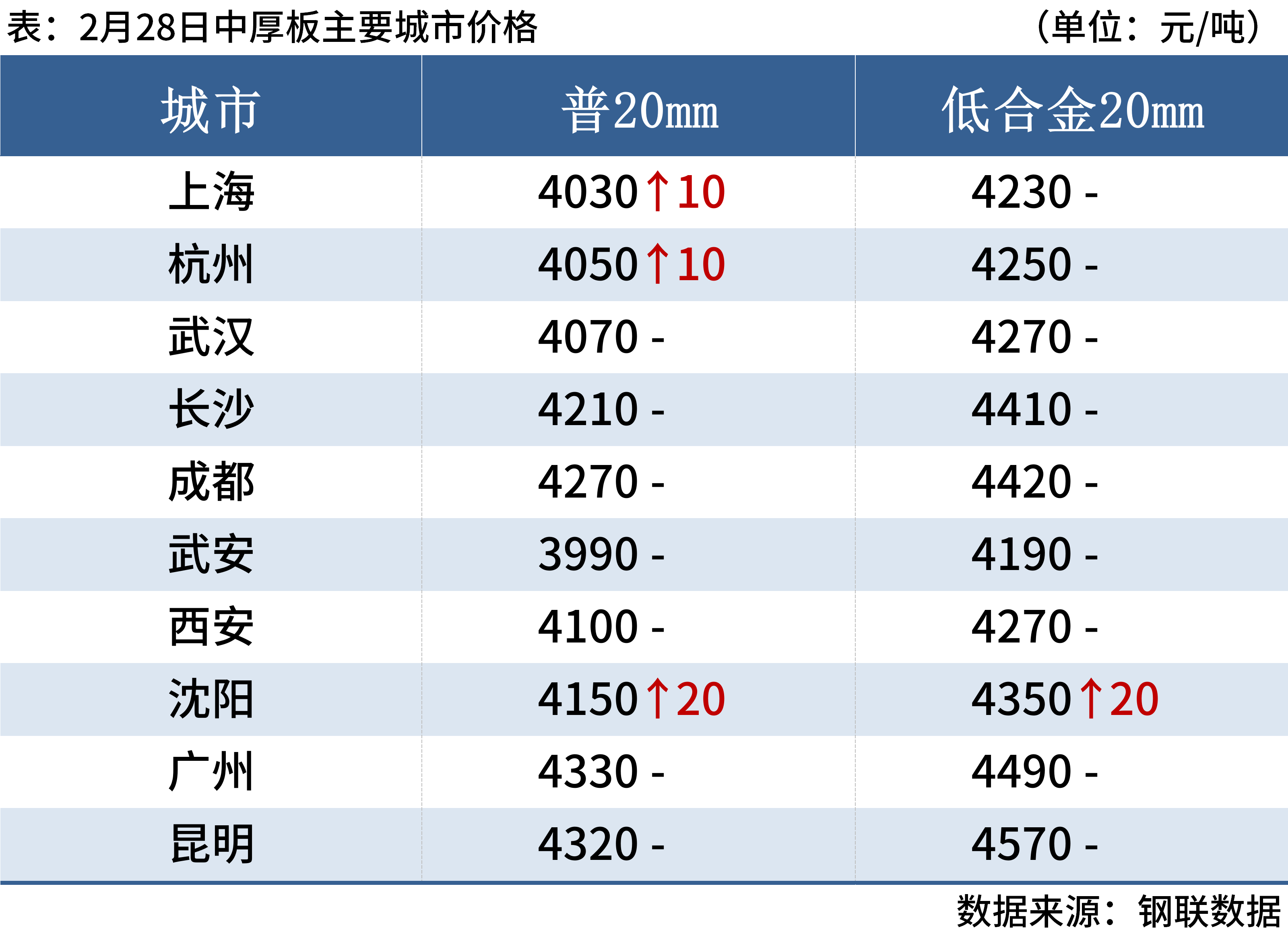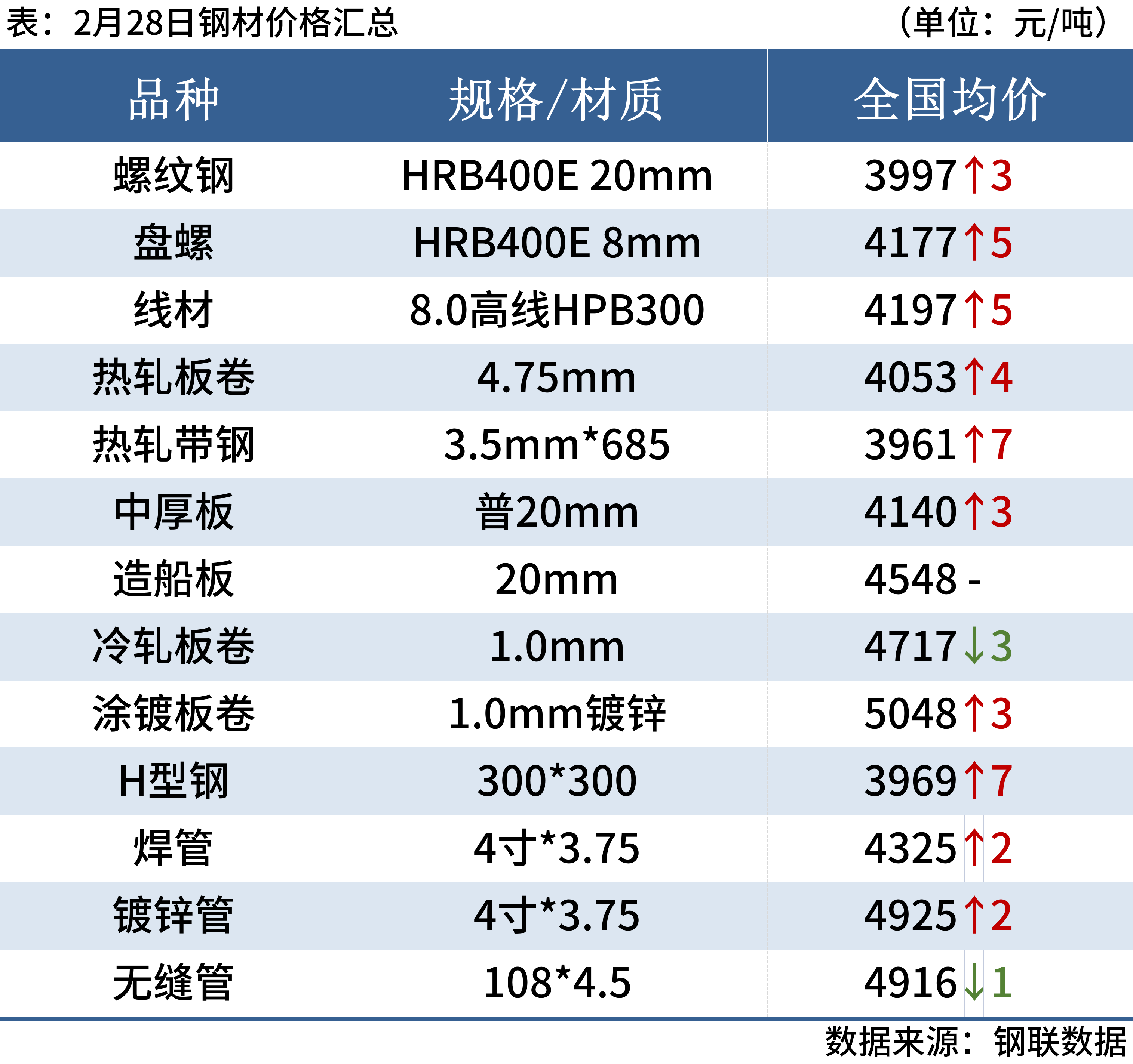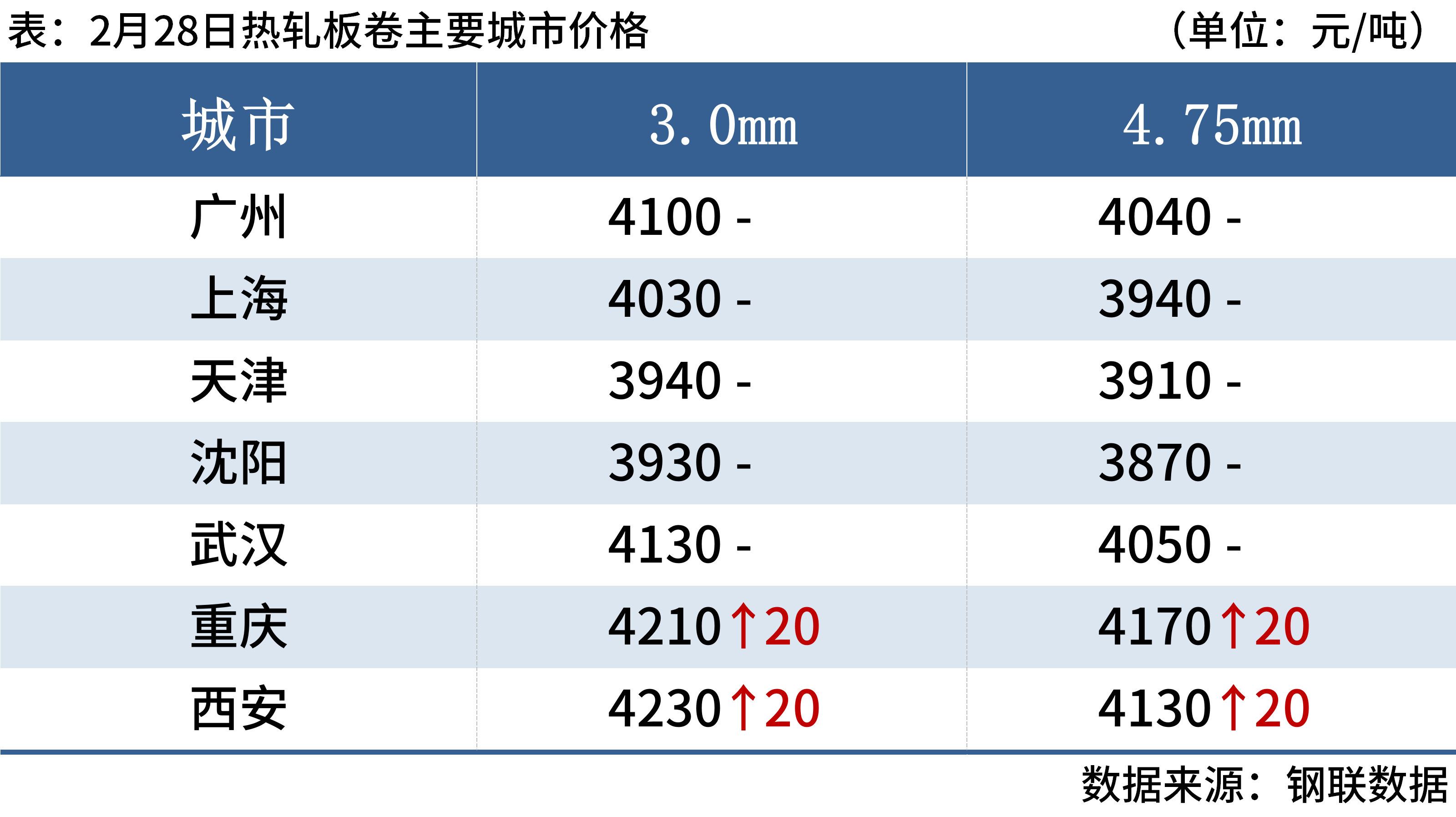 热轧板卷:2月28日,全国24个主要城市4.75mm热轧板卷均价4053元/吨,较上个交易日上涨4元/吨。元宵节过后,下游逐步复工,终端需求陆续恢复,商家反馈成交有所增加,市场心态有所好转,但目前仍处于需求验证阶段,近期价格或维持震荡运行。