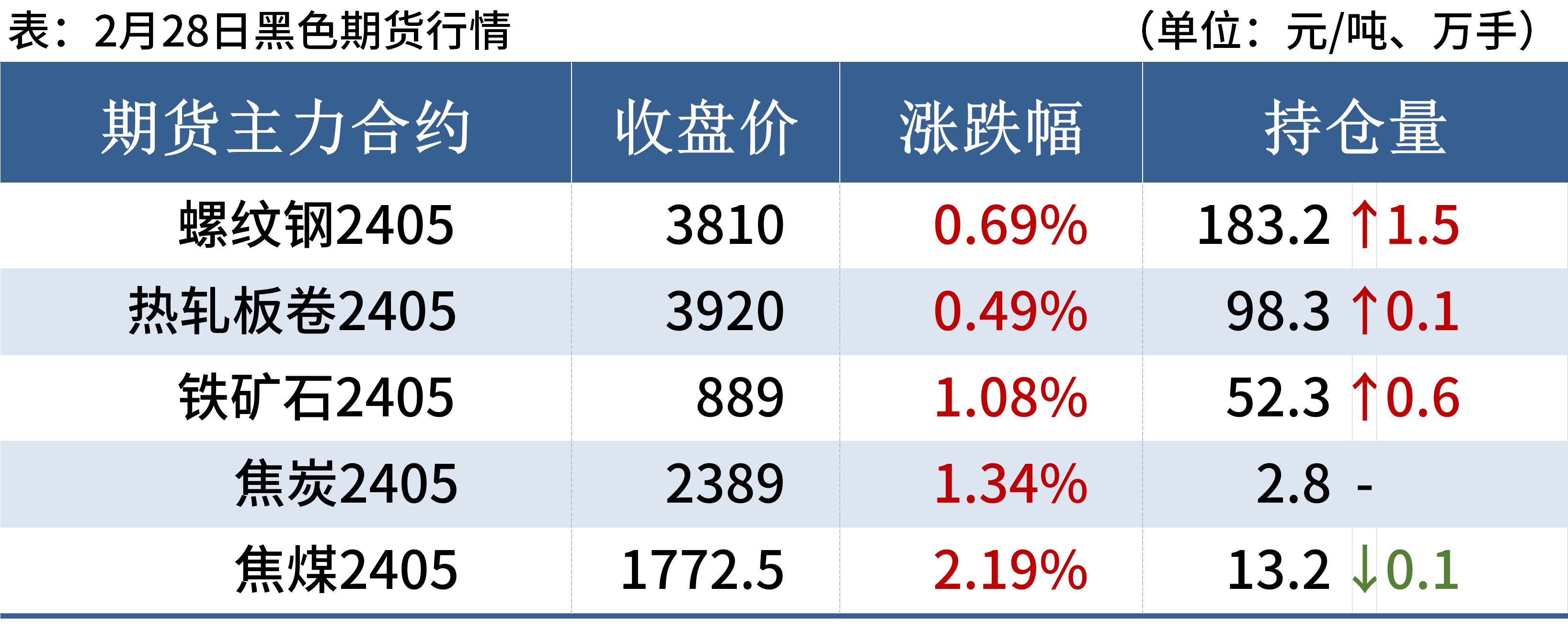 焦炭:2月28日,焦炭市场价格弱稳运行。供应方面,连续4轮的降价让整个焦化行业陷入深度亏损,产地焦企开工难以为继,限产范围进一步扩大,多保持30%-50%限产幅度,个别企业已有焖炉计划,且现阶段焦企出货压力虽小幅缓解但整体压力依旧较大;需求方面,宏观利好政策带动下,钢价筑底反弹,成交随之好转,钢厂利润修复明显,部分低库存钢厂已经开始逐步补库,预计短期内焦炭市场弱稳运行。
