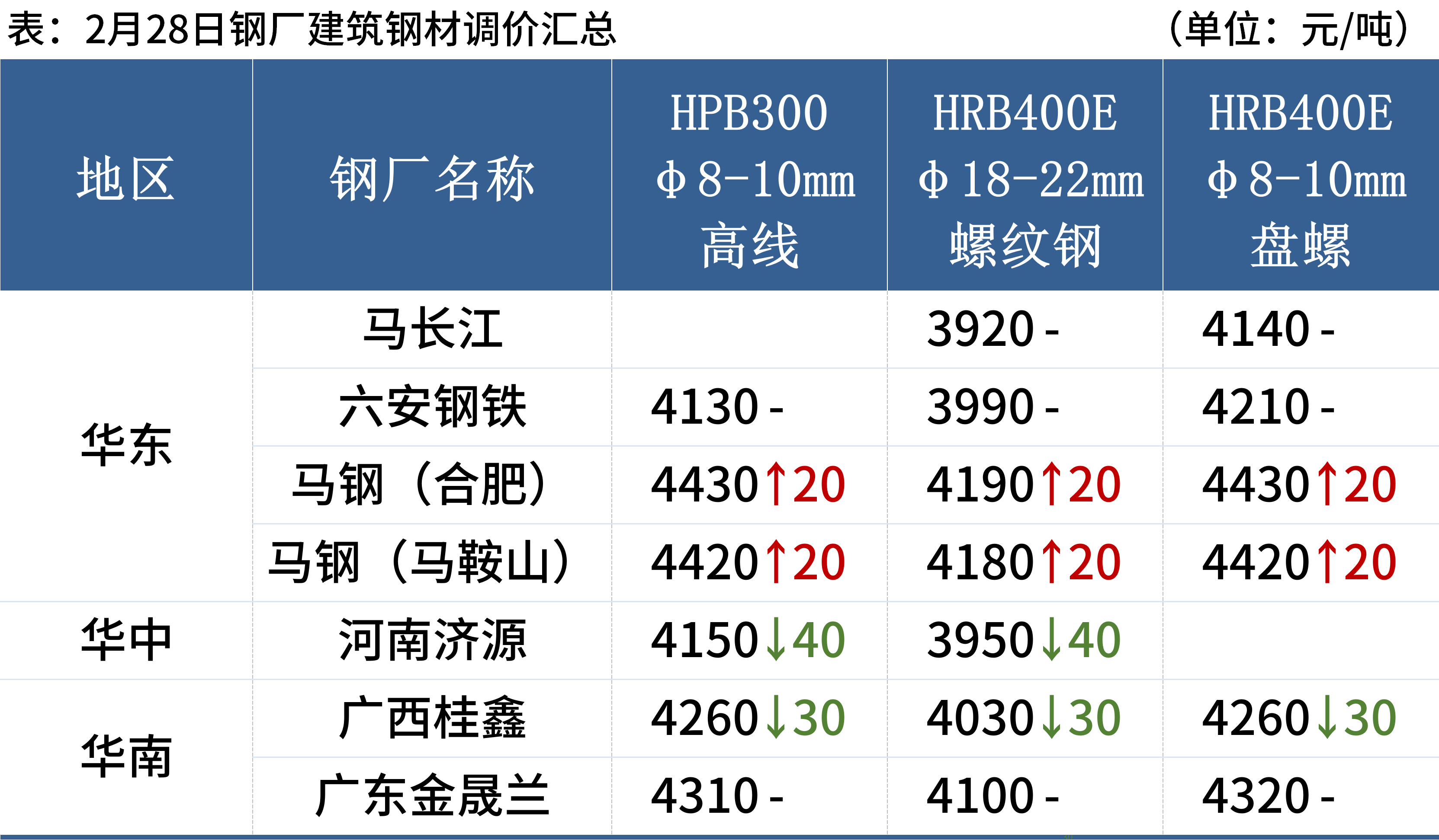 2月28日,2家钢厂建筑钢材出厂价格下调30-40元/吨,1家上调20元/吨