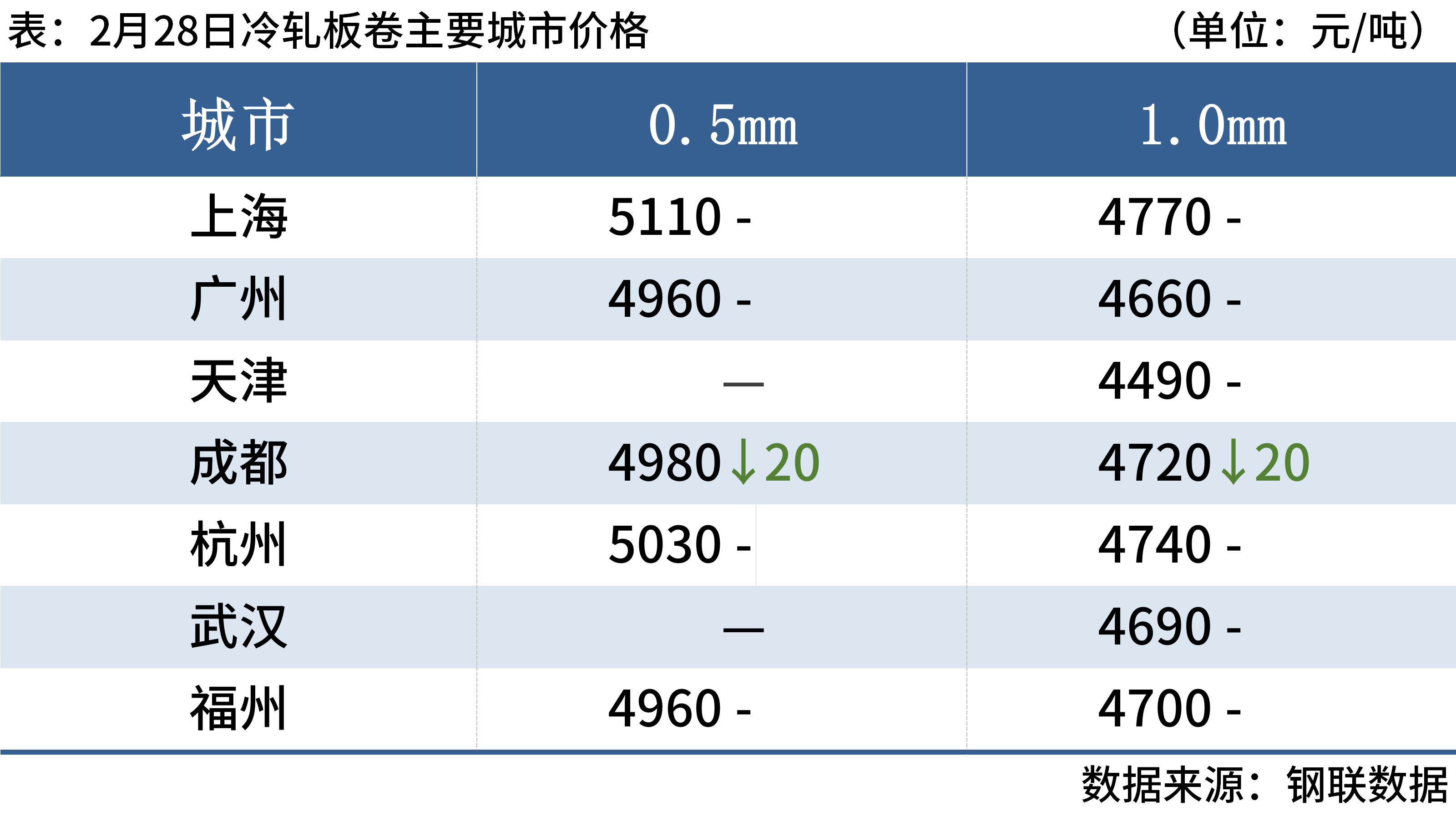 冷轧板卷:2月28日,全国24个主要城市1.0mm冷卷均价4717元/吨,较上个交易日下跌3元/吨。冷轧市场需求释放速度缓慢,库存处于累库阶段,贸易商为保成交仍选择降价出售。2月大部分钢厂结算价较1月相比不变,成本端有一定的支撑,但库存压力增大,贸易商对后市行情持谨慎偏悲观心态看待,预计29日全国冷轧价格整体窄幅震荡运行为主。
