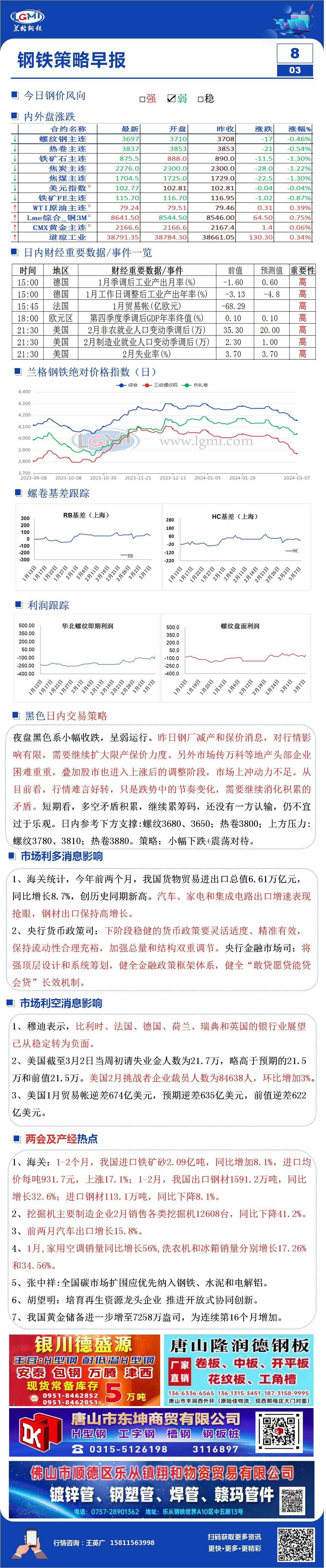 3月8日钢市早知道:黑色系再度走弱 出口向好 金融继续发力