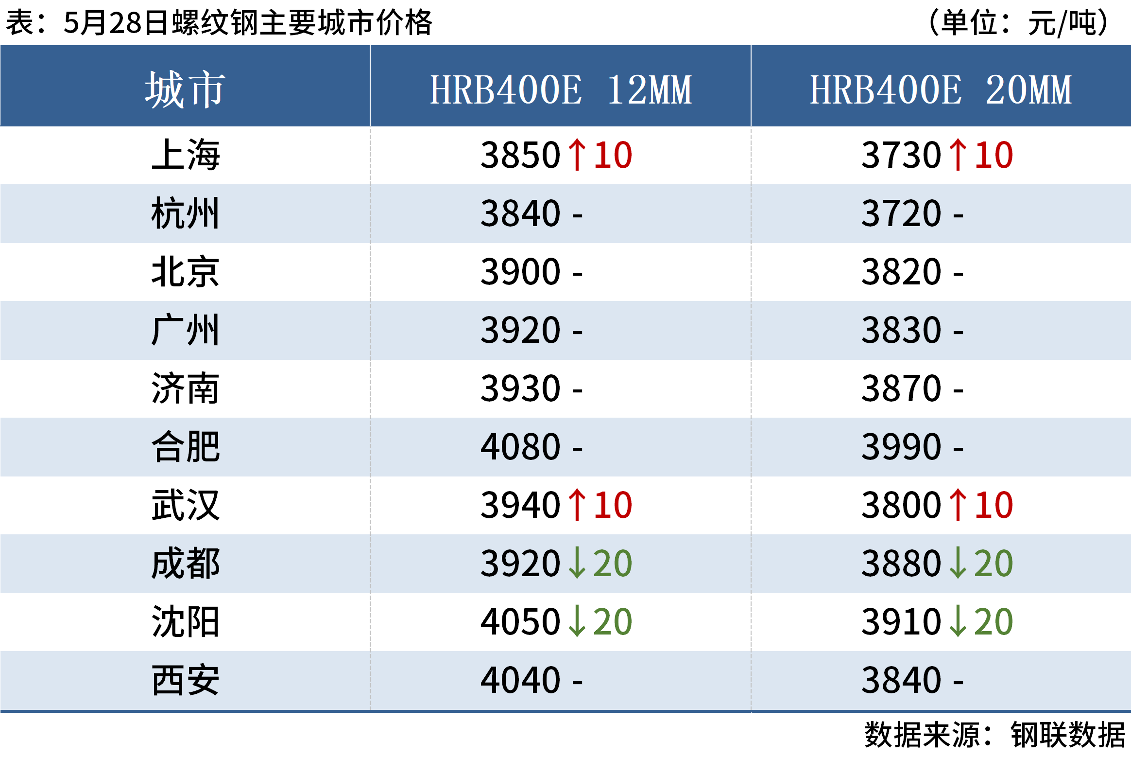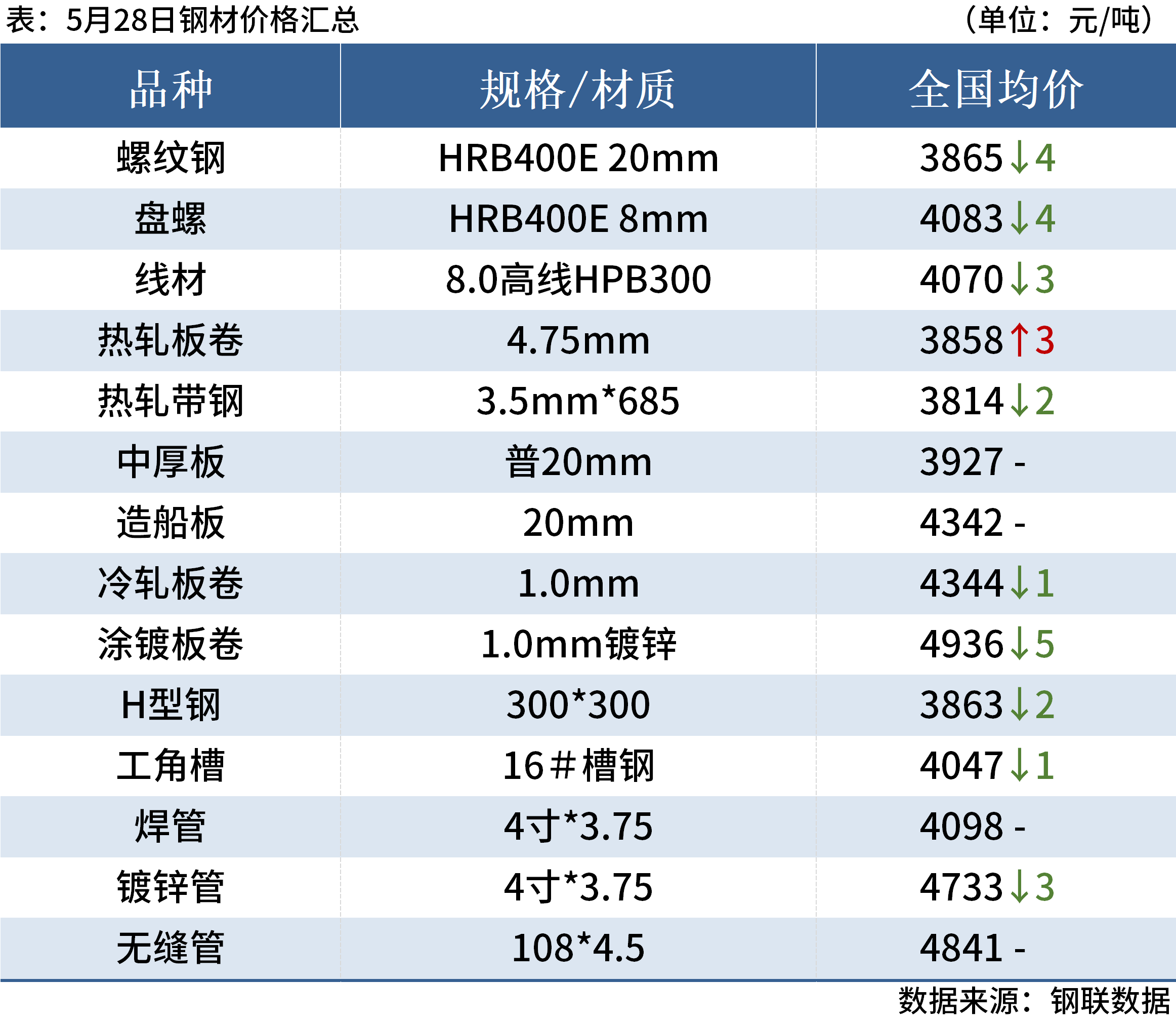 螺纹钢:5月28日,国内建筑钢材价格涨跌互现。全国主要城市螺纹钢均价3865元/吨,较上个交易日下跌4元。具体来看,期螺早盘偏强震荡,上午国内现货价格主流持稳,部分城市小幅探涨。午后期螺冲高回落,部分城市现货价格出现松动,商家反馈市场整体需求表现疲软,成交较上一交易日相比偏弱。短期来看,一方面近期钢厂利润修复,产量仍有增长空间,另一方面,随着螺纹钢去库放缓,消费端或阶段性见顶,预计29日国内建筑钢材价格或将震荡运行为主。
