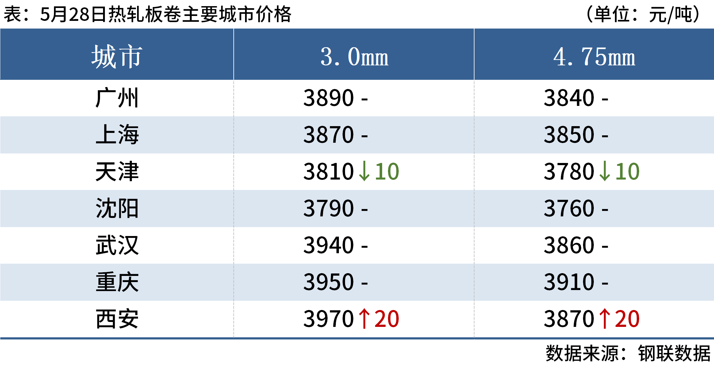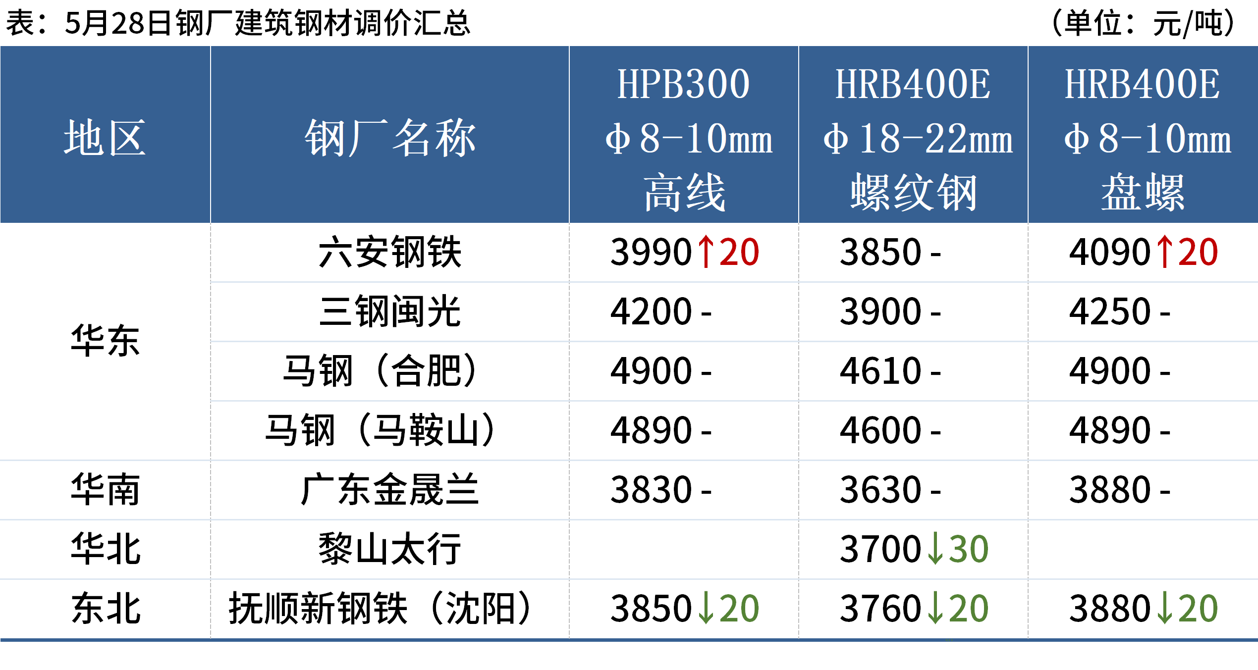 5月28日,2家钢厂下调建筑钢材出厂价20—30元/吨,1家钢厂上调出厂价20元/吨。
