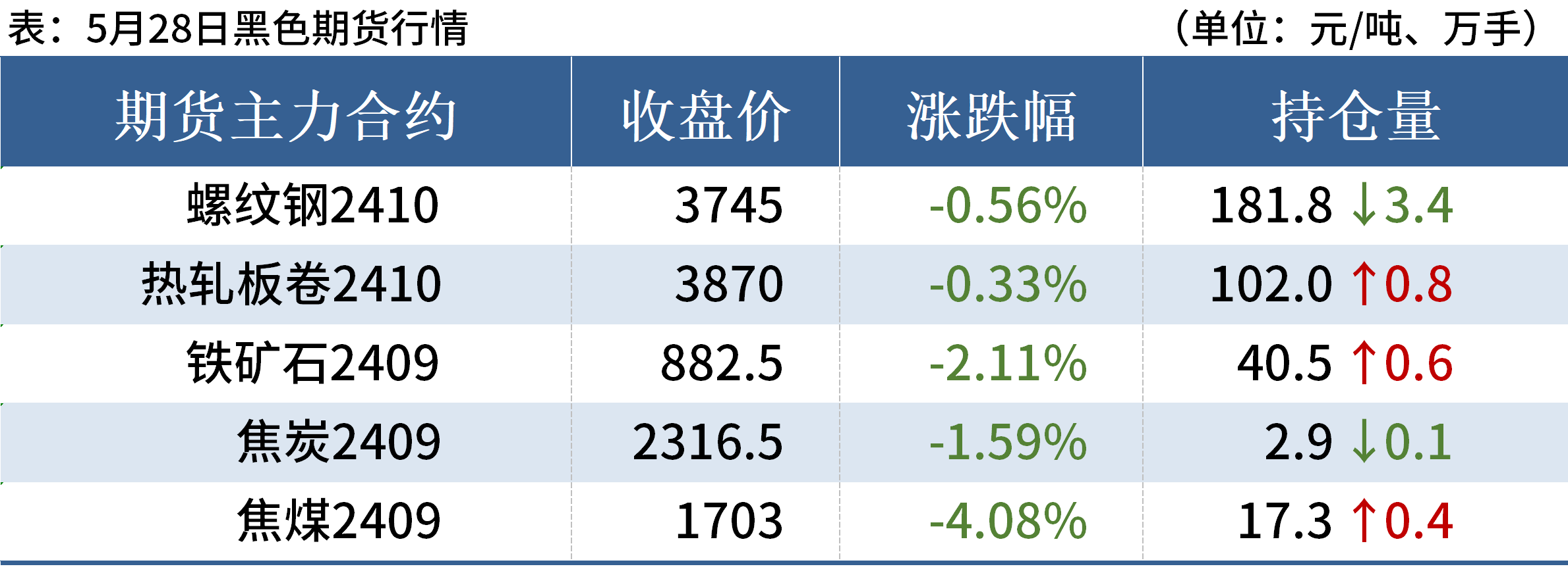 铁矿石:5月28日,山东港口进口铁矿主流品种价格较上一工作日偏弱运行,累计下跌5-10。卖盘方面,区域内贸易商报价积极性一般,截至目前现货市场成交以PB粉为主;山东远月市场询报情绪一般,暂无成交;买盘方面,区域内钢厂询盘较为谨慎,维持低库存运行。目前PB粉主流在872-875;卡粉主流在1035-1040;超特粉主流在720-725。