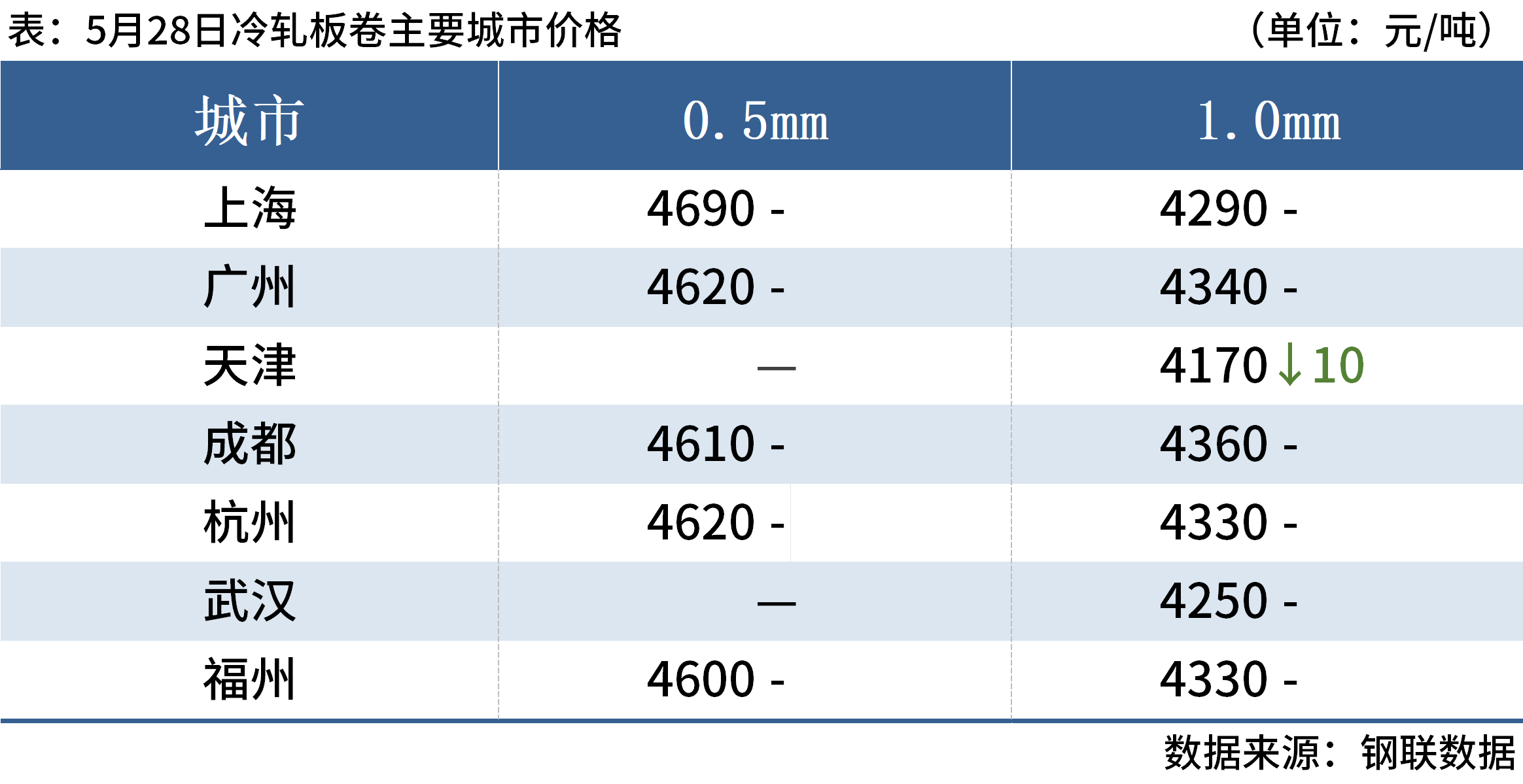 冷轧板卷:5月28日,全国冷轧板卷现货价格盘整偏弱运行,全国均价4344元/吨,较上一交易日下跌1元/吨。具体来看,早间商家多暂稳报价,随着期货热卷高开低走,市场观望情绪浓厚,日内成交不佳。据贸易商表示,冷轧板卷在库存去化不畅及下游消费不佳的情况下,价格不如热轧板卷涨速较快,冷热价差持续收窄,但尽管如此,目前生产端也暂未见检修需求,产能利用率继续高位维持,市场心态多谨慎,操作上仍以出货去库存为主。综上所述,预计29日国内市场冷轧板卷价格或将继续震荡偏弱运行。