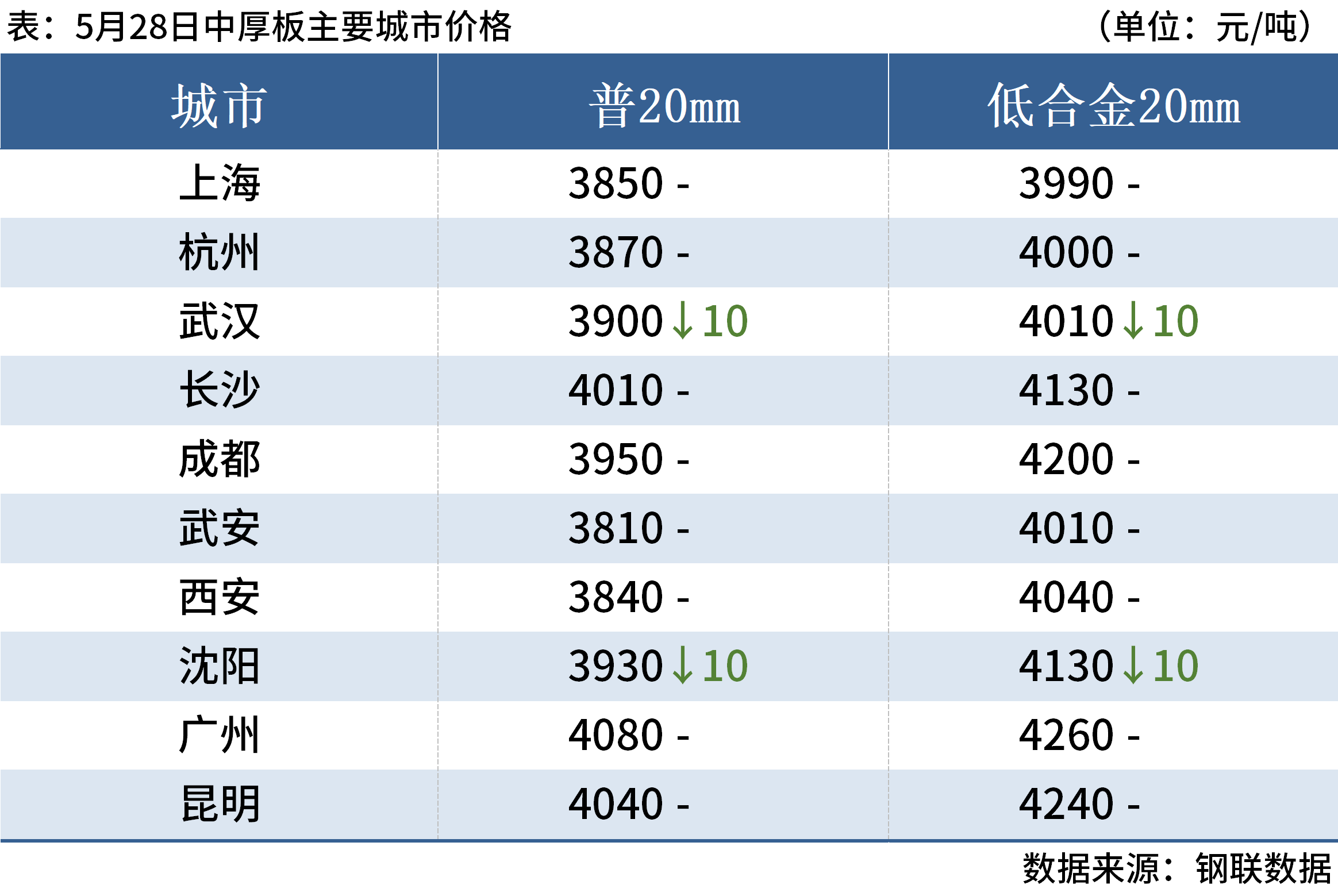 中厚板:5月28日,全国24个主要城市20mm普板均价3927元/吨,较上个交易日持平。期货盘面午后震荡趋弱运行,市场交投氛围偏冷清,整体成交一般。据市场反馈,原料方面来看,焦炭发起提涨,铁矿石价格震荡运行,成本支撑尚可,钢厂生产积极性一般。市场方面来看,对高价资源接受程度有限,低价按需采购为主,整体成交量较昨日有所下降。现阶段贸易商操作偏谨慎,快进快出降库为主,部分暗降出货以促成交。综合来看,预计29日国内中厚板价格窄幅震荡运行。