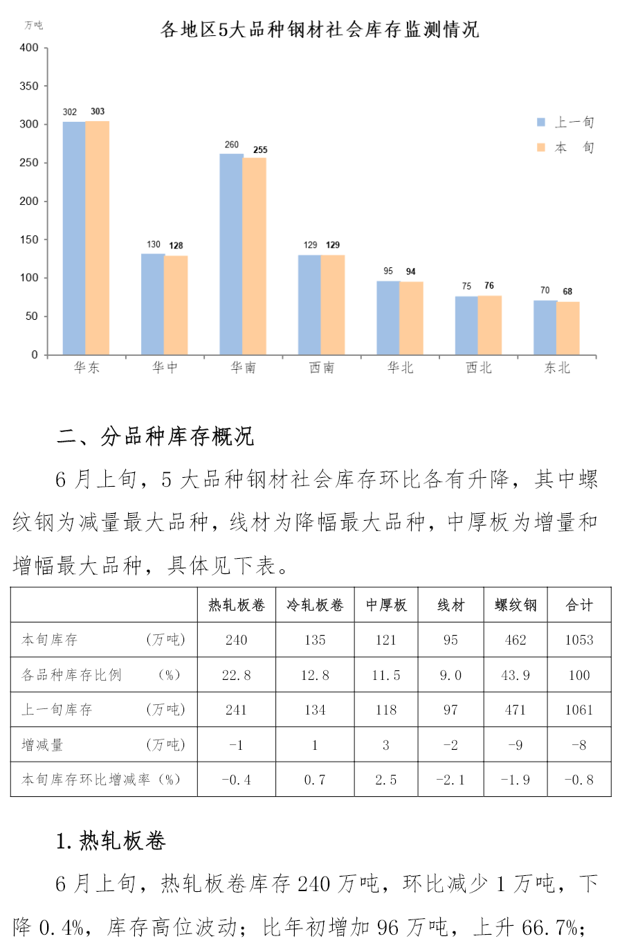 中钢协:6月上旬钢材社会库存1053万吨 环比下降0.8%