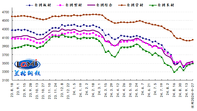 2024年第38周(2024.9.16-9.20)兰格钢铁全国绝对价格指数为3518元,较上周上升1.3%,较去年同期下降15.6%;其中,兰格钢铁长材绝对价格指数为3473元,较上周上升1.8%,较去年同期下降12.4%;兰格钢铁型材绝对价格指数为3482元,较上周上升1.2%,较去年同期下降14.9%;兰格钢铁板材绝对价格指数为3474元,较上周上升0.9%,较去年同期下降19.1%;兰格钢铁管材绝对价格指数为4027元,较上周上升0.3%,较去年同期下降12.5%。