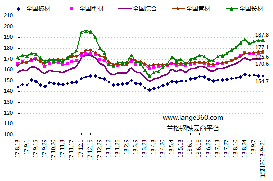 ?2018年第37周(2018.9.10-9.14)兰格钢铁全国钢材综合价格指数达到170.3点,较上周下降0.08%,较去年同期上升4.75%。其中,LGMI长材价格指数为187.2点,较上周上升0.16%,较去年同期上升6.84%;LGMI型材价格指数为175.3点,较上周上升0.13%,较去年同期上升3.00%;LGMI板材价格指数为154.7点,较上周下降0.46%,较去年同期上升3.20%;LGMI管材价格指数为176.5点,较上周上升0.54%,较去年同期上升3.90%。