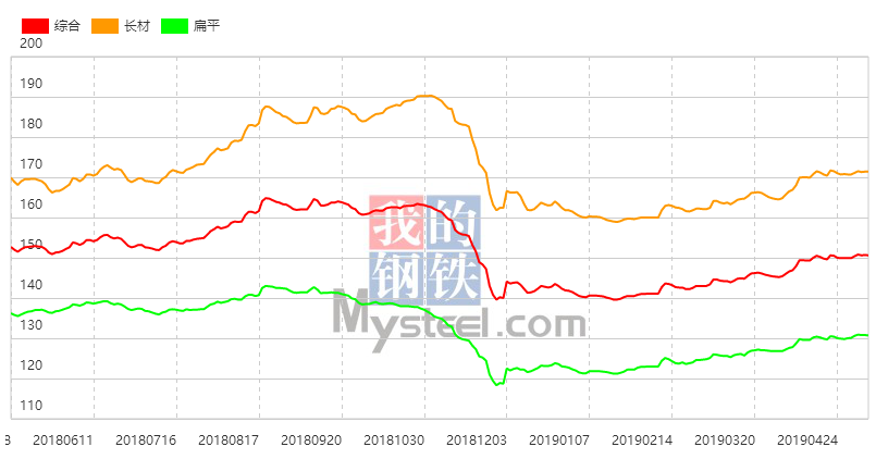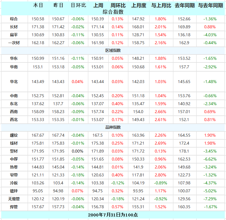 ?5月8日,国内钢材指数(Myspic)综合指数报150.58(绝对价格指数4238.2),较上一交易日下跌0.06%。其中,螺纹钢指数报167.67点(绝对价格指数4238.2),较上一交易日下跌0.04%;热卷指数报144.83(绝对价格指数4060.6),较上一交易日下跌0.14%。