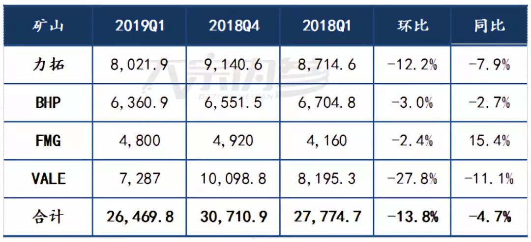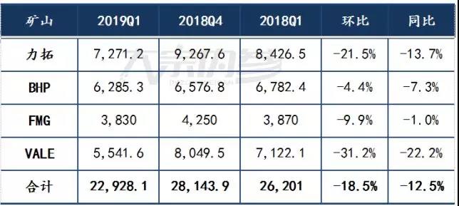 2019年第1季度铁矿产量26469.8万吨,环比减少4241.1万吨,同比减少1304.9万吨;铁矿石发货量22928.1万吨,环比减少5215.8万吨,同比减少3272.9万吨。