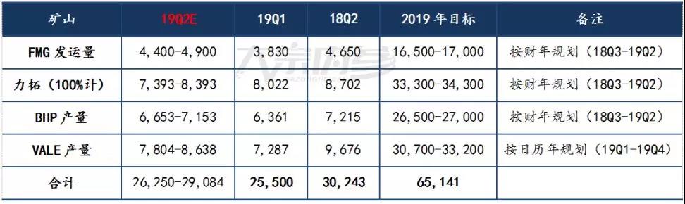 四大矿山铁矿石生产计划及2019年2季度预测(单位:万吨)