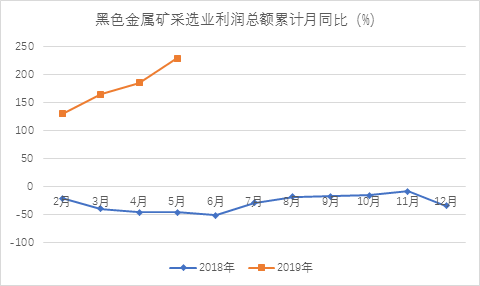这与今年钢材价格重心下移与原料价格上涨有关。与钢铁行业形成鲜明对比,统计局数据显示,今年黑色金属采矿业利润大幅增长,1~5月利润总额累计同比增长甚至达到了229%。