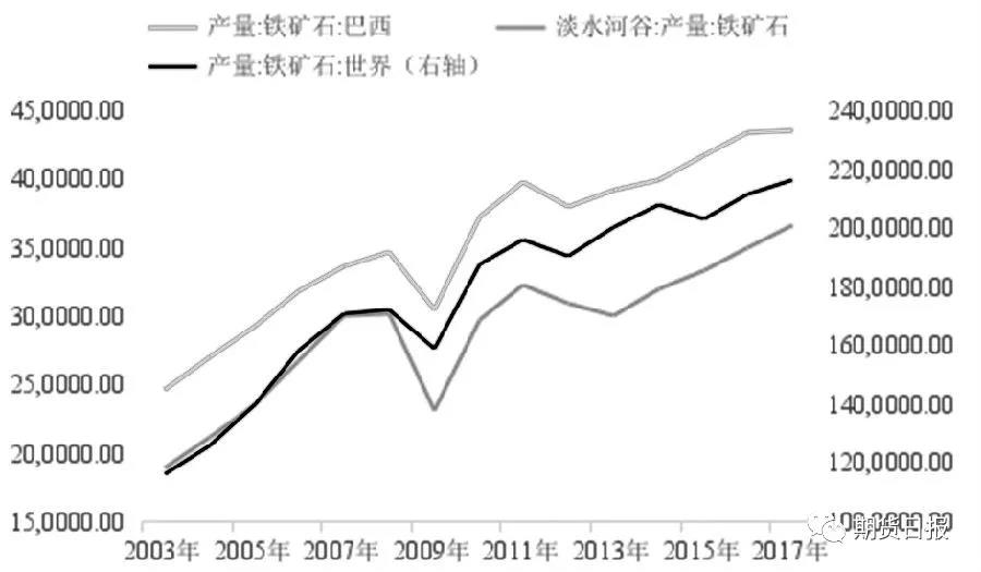 图为2003—2017年Vale、巴西、世界铁矿石产量走势(单位:千吨)