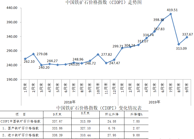 据钢铁协会监测,9月末,中国铁矿石价格指数(CIOPI)为337.67点,环比上升24.58点,升幅为7.85%,环比由降转升。其中:国产铁矿石价格指数为333.86点,环比上升6.76点,升幅为2.07%;进口铁矿石价格指数为338.39点,环比上升27.95点,升幅为9.00%。(见下图、表)