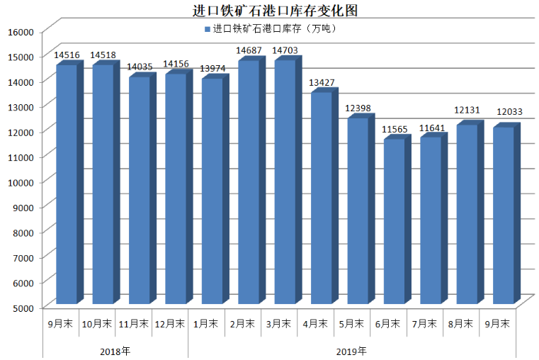 2、进口矿供应增加,铁矿石市场进一步宽松8月份,全国铁矿石进口量9486万吨,是2018年2月以来的最大单月进口量,环比增加了383万吨。9月末,全国进口铁矿石港口库存量为1.20亿吨,环比下降98万吨,降幅为0.81%。随着进口铁矿石到港量的增多和废钢用量的增加,铁矿石供给形势将进一步宽松,供大于求态势更加明显,价格会振荡走低。(见下图)