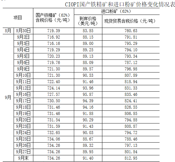 9月末,CIOPI国产铁精矿含税价格为734.26元/吨,环比上升14.87元/吨,升幅为2.07%;CIOPI进口粉矿到岸价格为91.40美元/吨,环比上升7.55美元/吨,升幅为9.00%,比国产铁精矿价格升幅高6.94个百分点。(见下图)
