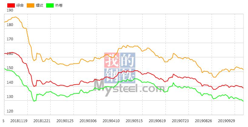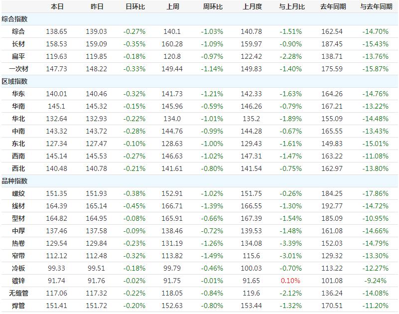 10月16日,国内钢材指数(Myspic)综合指数报138.65(绝对价格指数3910.8),较上一交易日下跌0.27%。其中,螺纹钢指数报151.35(绝对价格指数3825.6),较上一交易日下跌0.38%;热卷指数报129.54(绝对价格指数3631.9),较上一交易日下跌0.23%。