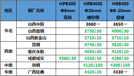 ◎16日,河钢中旬价格:盘螺下调150至4090,螺纹下调130-150,小螺纹3950,大螺3850,28-32螺3950。