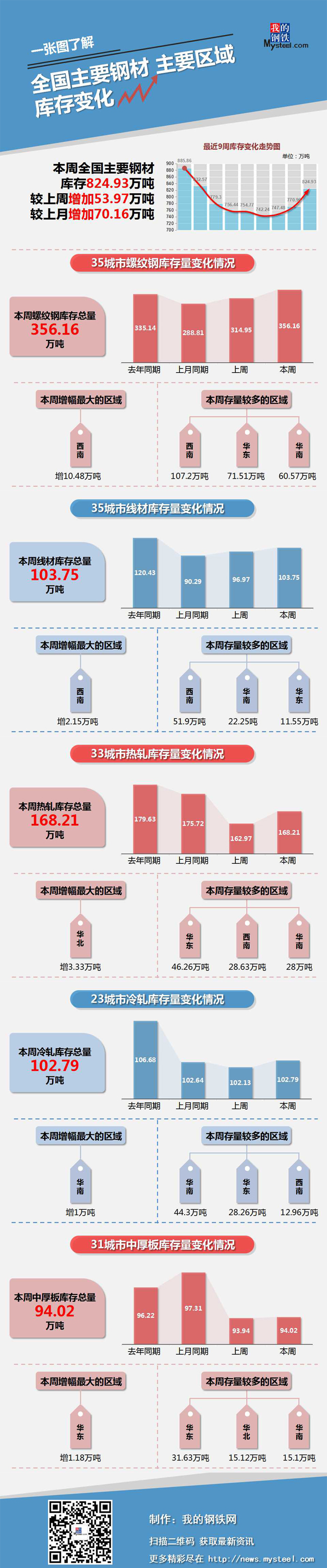 本周,全国主要钢材社会库存824.93万吨,较上周增加53.97万吨,较上月增加70.16万吨;螺纹钢库存总量356.16万吨。