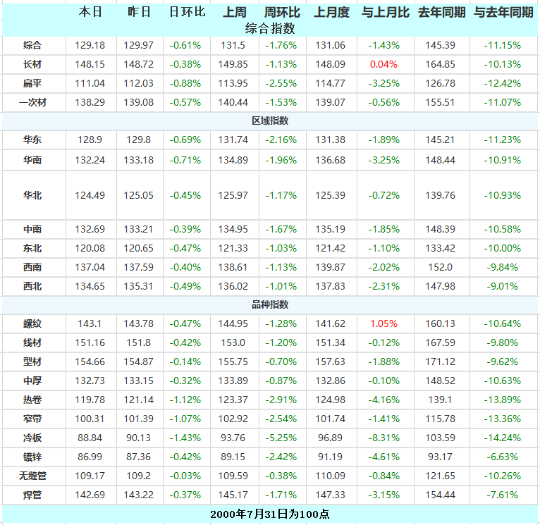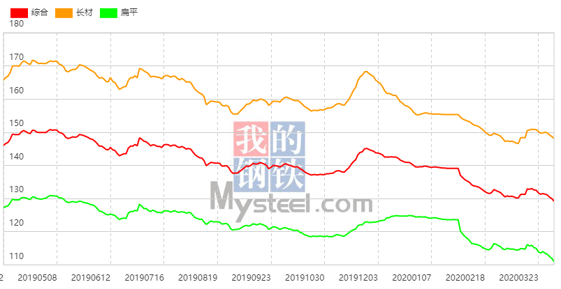 4月1日,国内钢材指数(Myspic)综合指数报129.18(绝对价格指数3639.5),较上一交易日下跌0.61%。其中,螺纹钢指数报143.10(绝对价格指数3617.1),较上一交易日下跌0.47%;热卷指数报119.78(绝对价格指数3358.5),较上一交易日下跌1.12%。