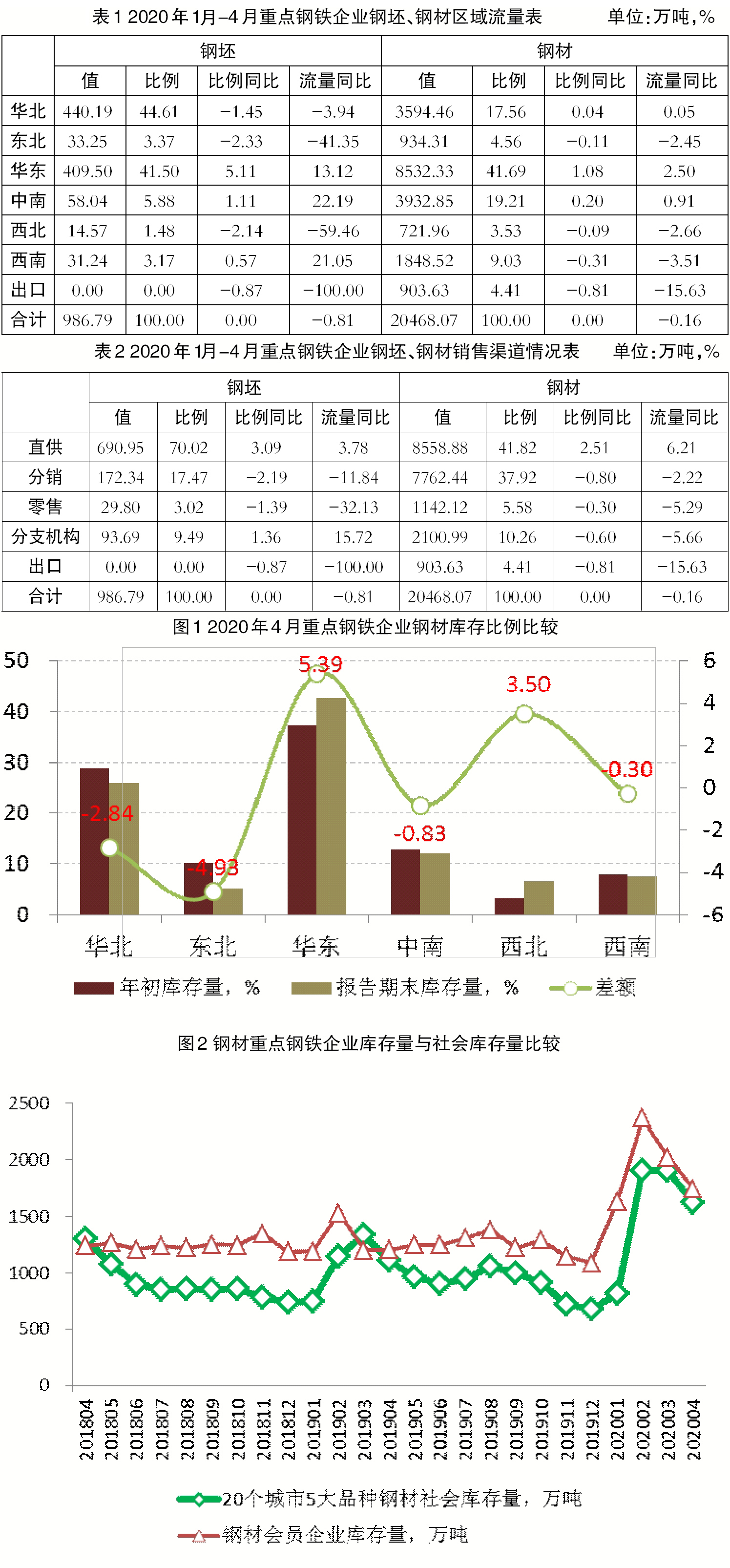 4月末,华北、东北、中南和西南地区钢材库存量占重点钢铁企业库存量的比例,低于今年初库存量占重点钢铁企业库存量的比例,分别减少了2.84个、4.93个、0.83个、0.30个百分点;华东和西北地区钢材库存量占重点钢铁企业库存量的比例,高于今年初库存量占重点钢铁企业库存量的比例,分别提高了5.39个、3.50个百分点。