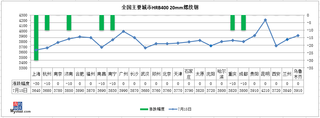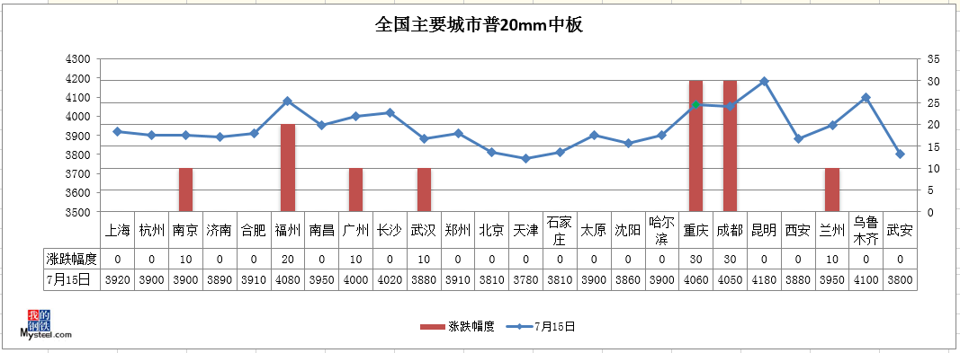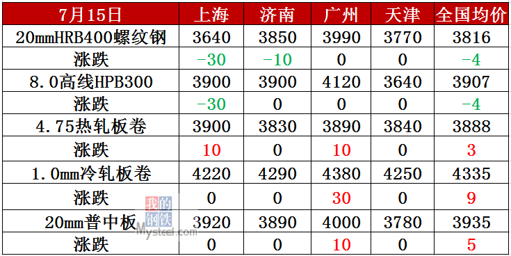 我的钢铁讯:7月15日,国内建材市场震荡偏弱,板材市场震荡偏强,唐山普方坯稳报3400元/吨。早盘期螺弱势震荡,国内建筑钢材价格稳中有跌。午后期货小幅反弹,市场心态稍有好转,贸易商稳价积极出货。