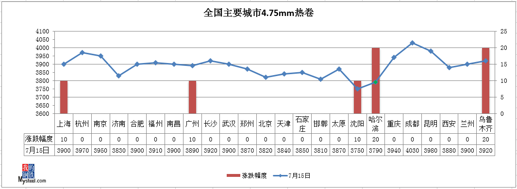 热轧板卷:15日热轧板卷全国主要城市价格小幅震荡,截止发稿时3.0热轧板卷全国均价3953元/吨,较上个交易日上涨3元/吨,4.75热轧板卷全国均价3888元/吨,较上个交易日上涨3元/吨。分目前商家心态较好,虽稍有恐高,但依然不愿低价出售,挺价情绪较强,短期来看,市场情绪较好,南下资源依然不多,而随着南方持续阴雨,长江涨水,导致华中、西南地区资源流动性下降,加上近期价格快速拉高后成交难以放量,库存或有小幅增加,但整体库存压力不大,商家挺价情绪仍在。综合来看,明日热轧板卷市场价格或仍将维持高位震荡运行。